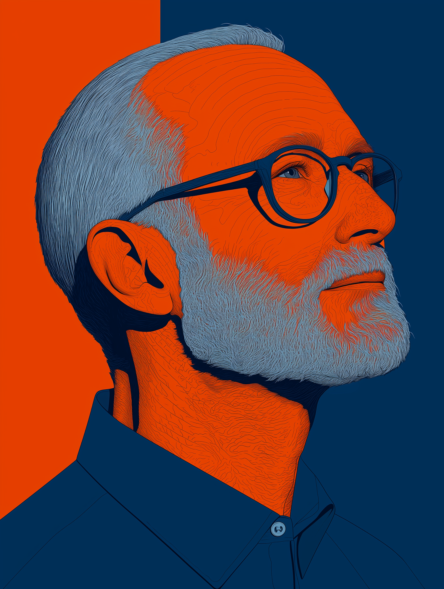 Bold digital illustration of an older man with glasses and a white beard, set against a striking orange and blue background.