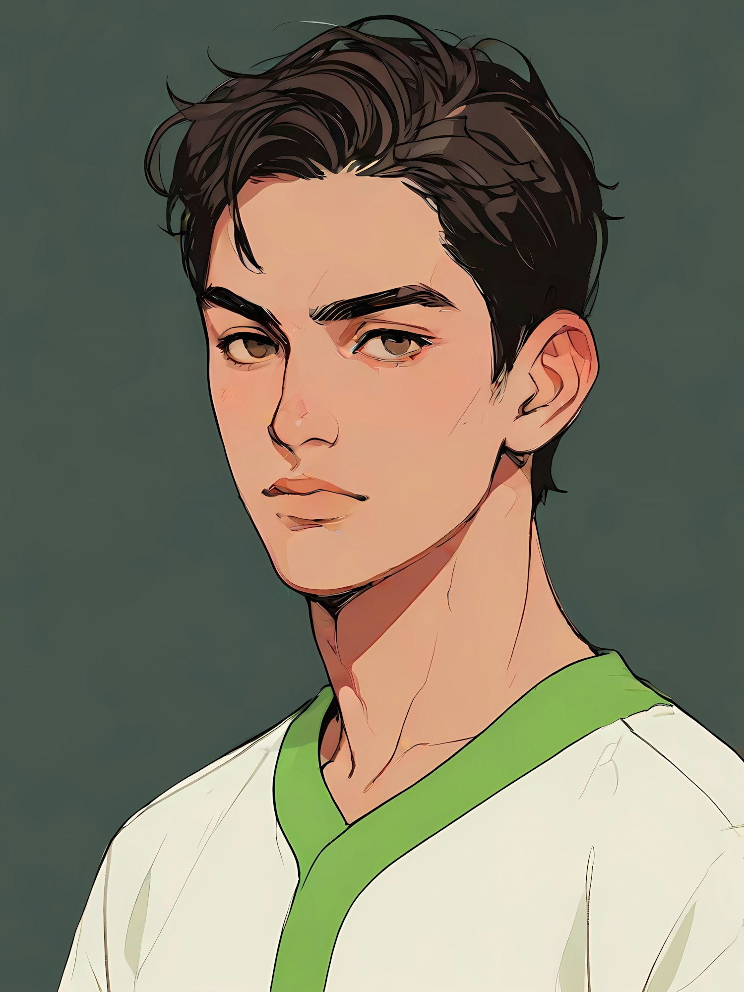 Stylized illustration of a young man with dark brown hair, light brown eyes, and a white shirt with a green neckline on a muted green background.