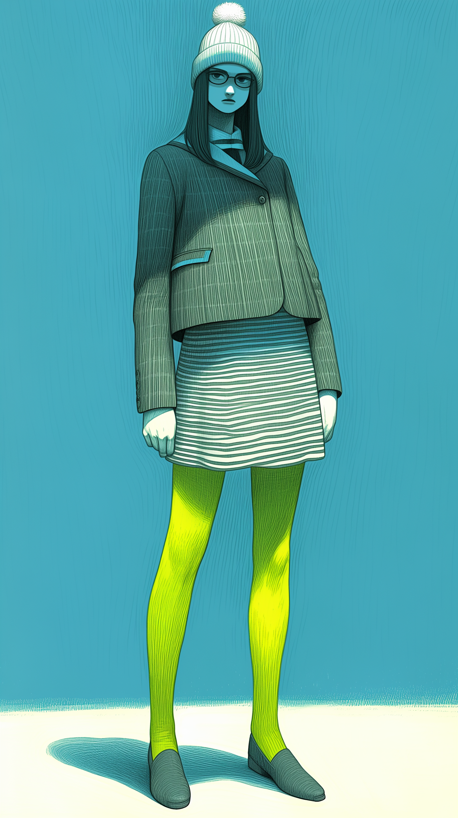 Stylized illustration of a person in a green jacket, striped skirt, and yellow tights, set against a textured blue background.