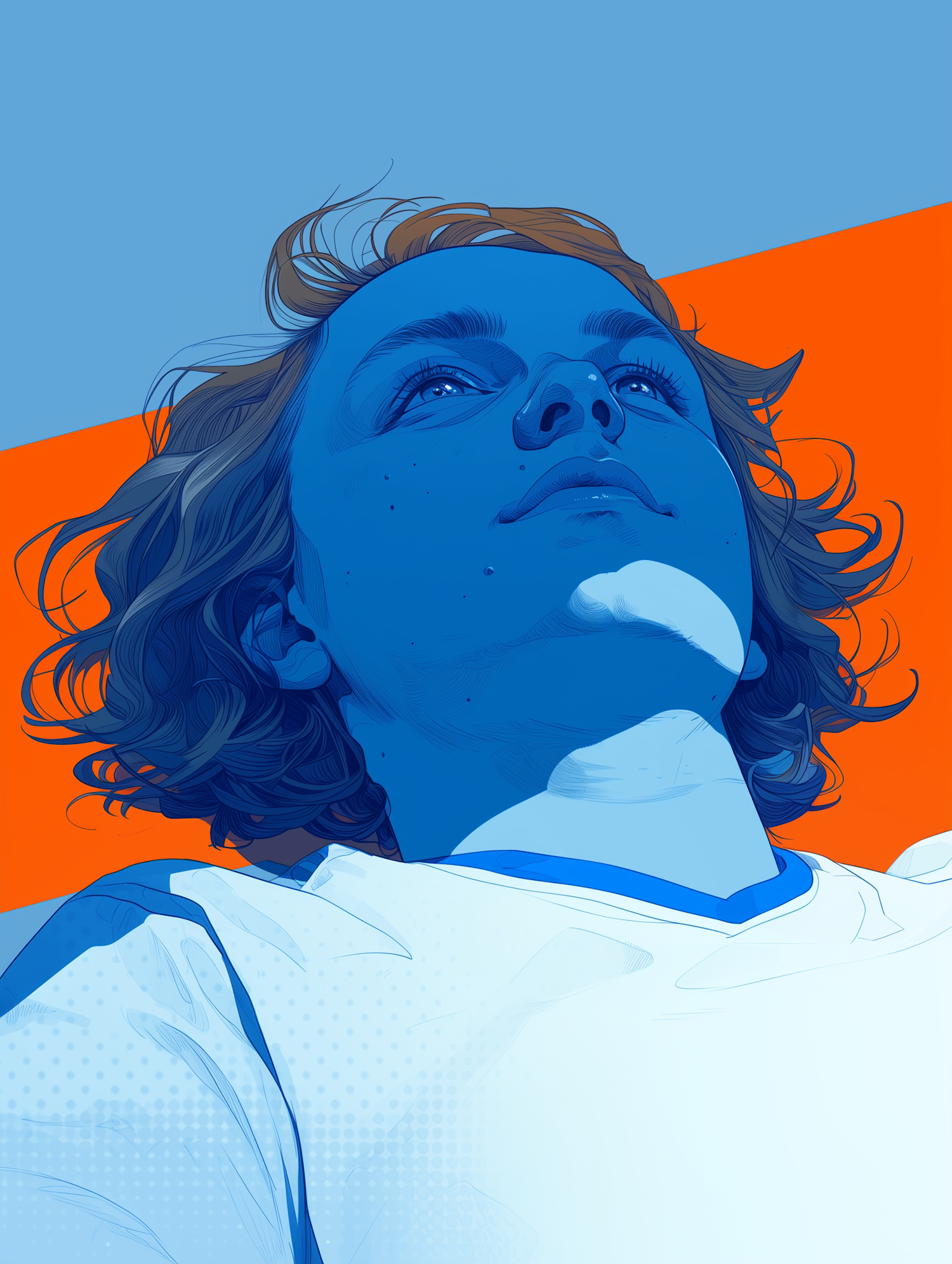 Stylized illustration of a person gazing upward, with bold blue tones and a vibrant orange and blue background for striking contrast.