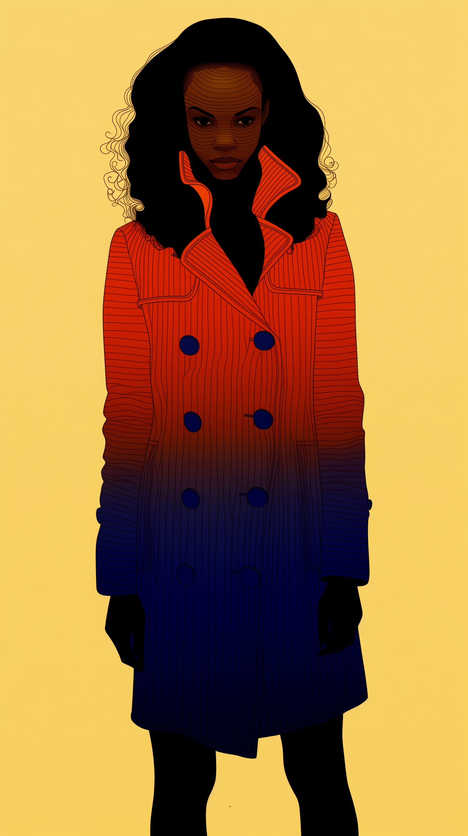 Stylized illustration of a person in a gradient red-to-blue coat against a yellow background, emphasizing bold contrasts and clean lines.
