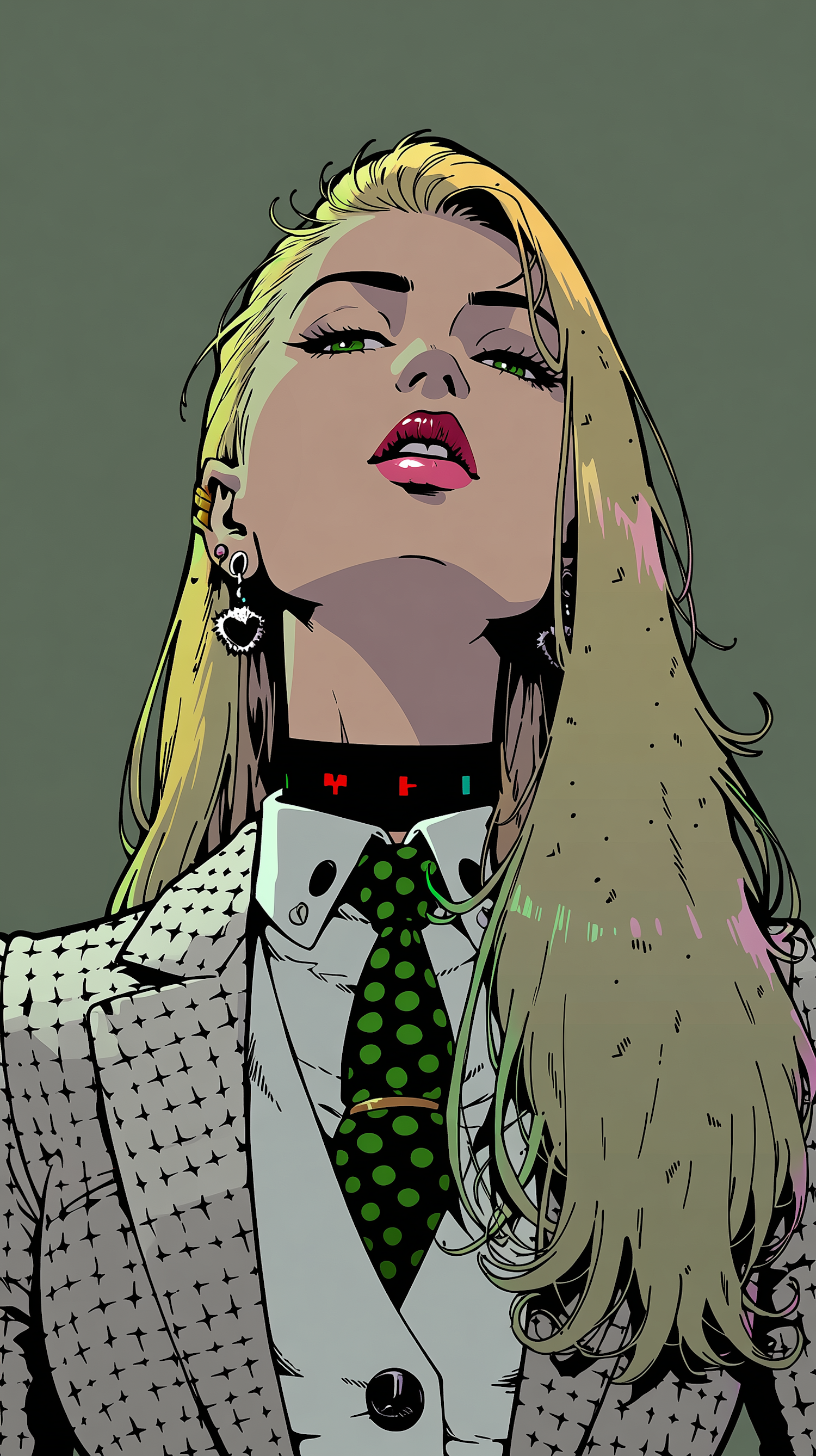 Stylized illustration of a confident individual with blonde hair, a patterned suit, and a green polka-dot tie against a muted green background.