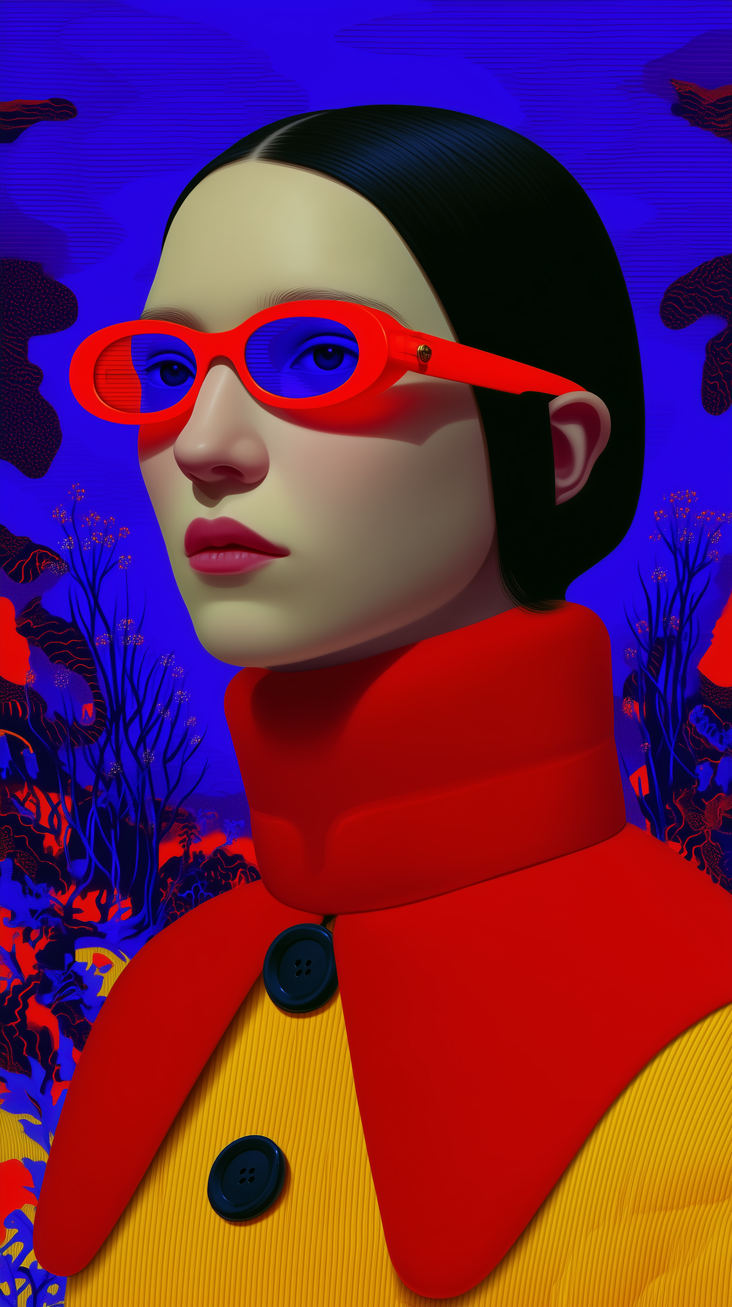 Stylized portrait of a person in red glasses and coat against a vivid blue abstract background with floral patterns.