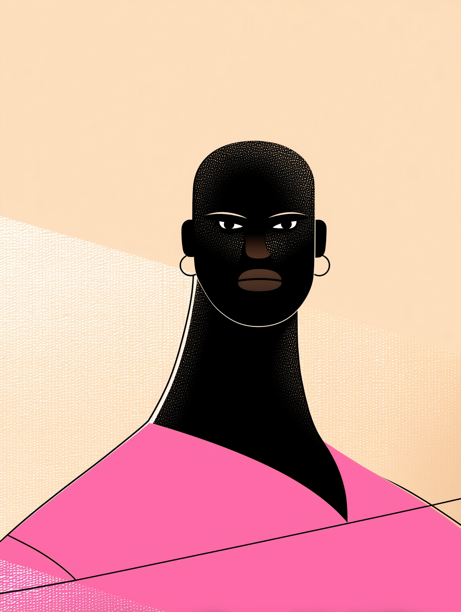Stylized illustration of a person with a bald head, dark skin, and a pink garment, set against a textured beige background.