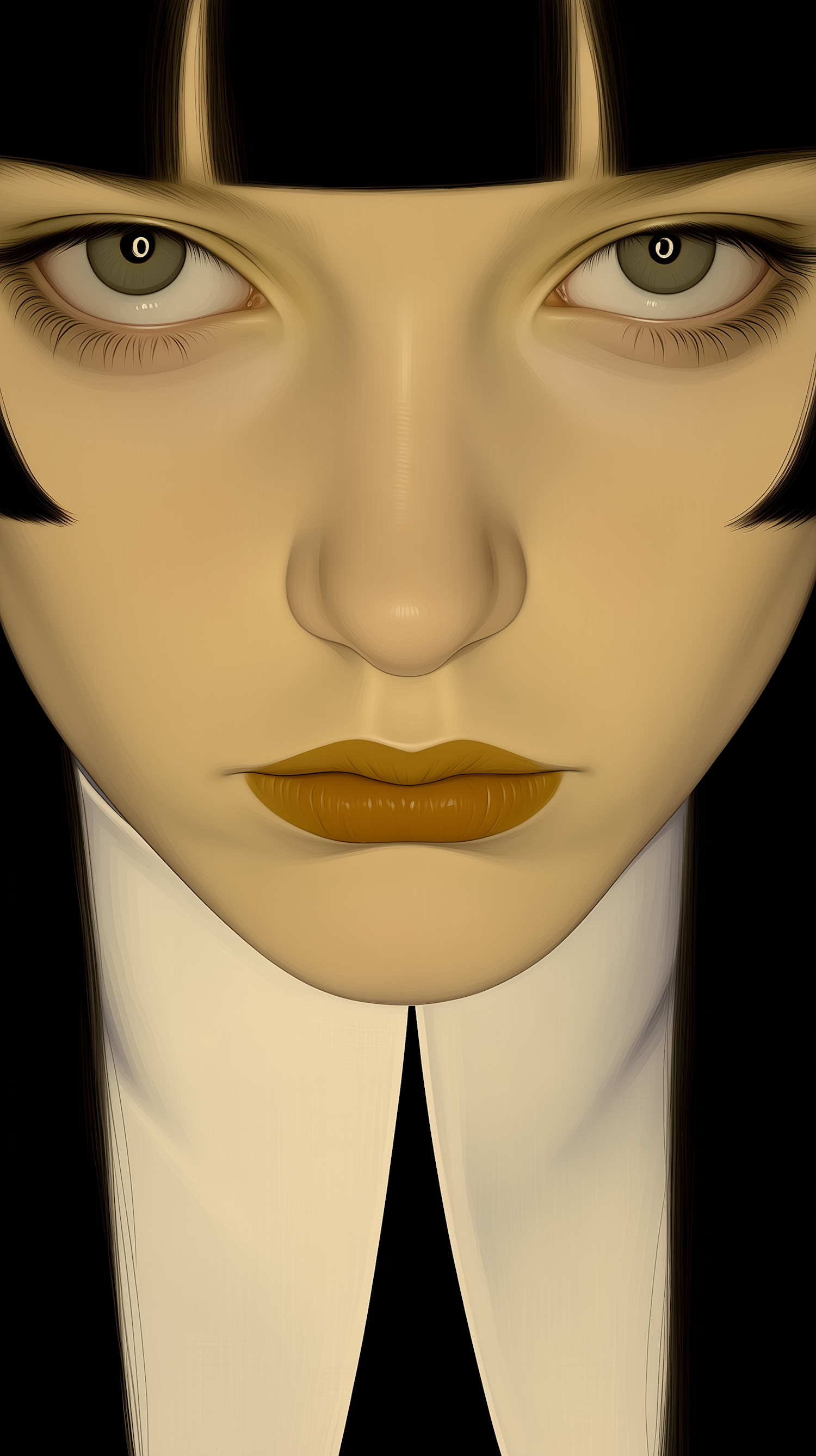 Stylized digital portrait focusing on a person's face with green eyes, dark hair, and mustard-colored lips, set against a dark background.