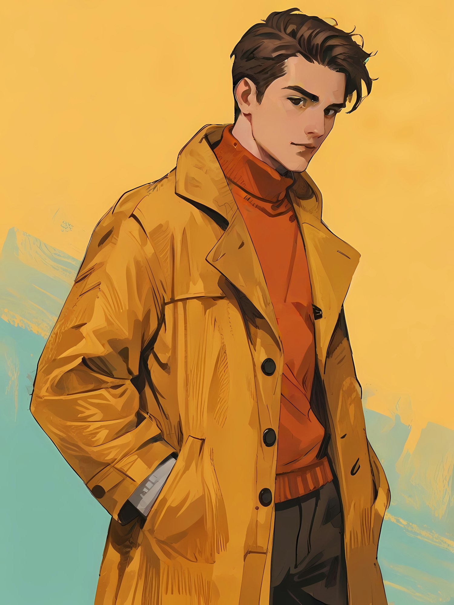 Stylized artwork of a man in a mustard coat and rust turtleneck against a vibrant yellow background with teal accents.