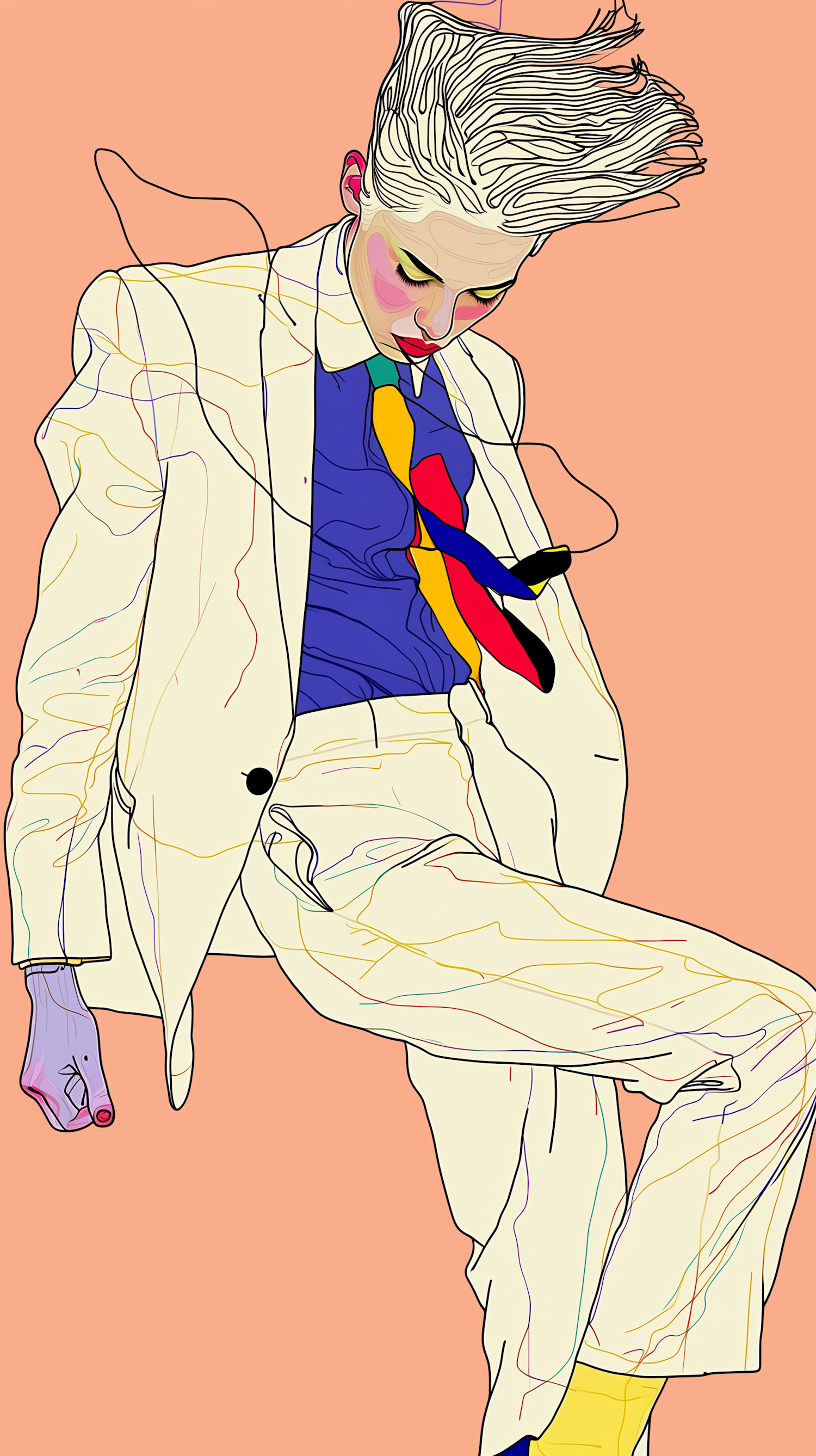 Stylized illustration of a person in a cream suit, blue shirt, and colorful tie, set against a peach background.
