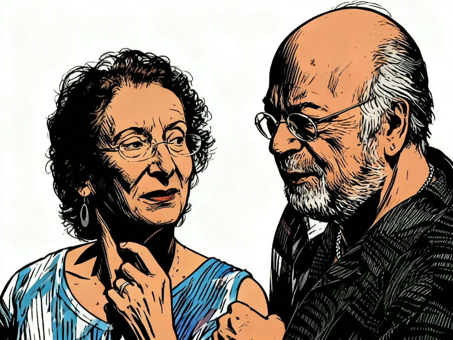 Stylized illustration of a man and woman with expressive features, glasses, and detailed clothing, set against a plain background.
