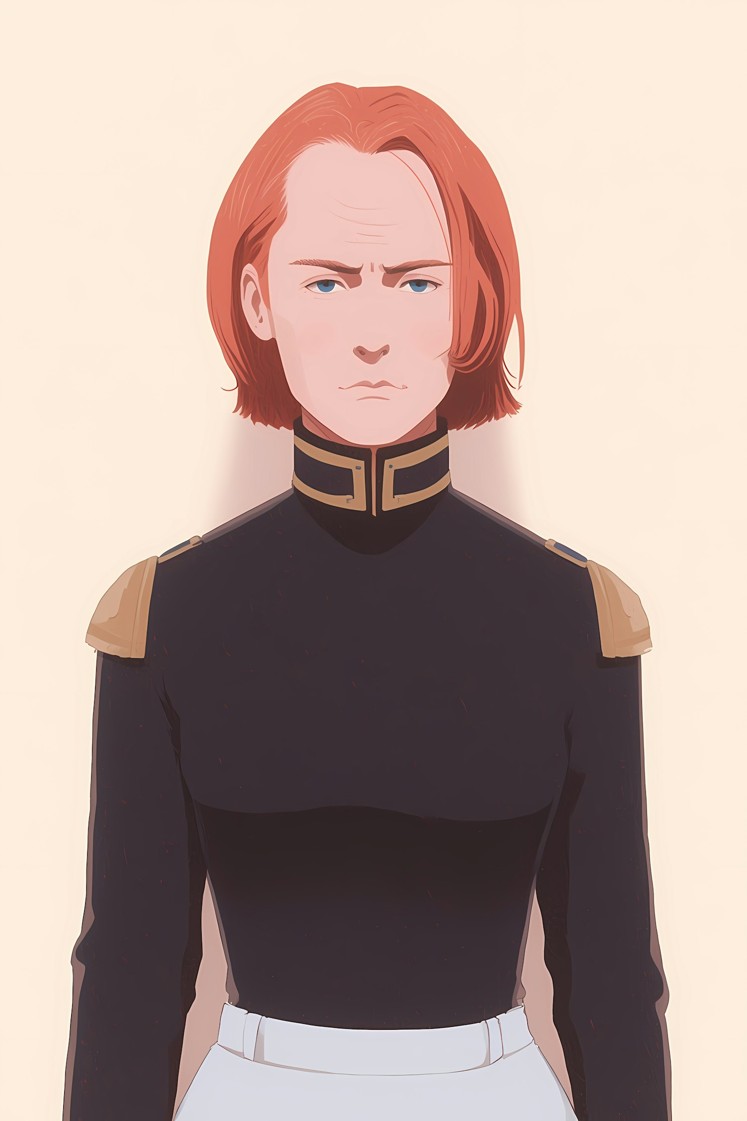 Illustration of a person in a formal military-style uniform with gold accents, set against a neutral background, showcasing a serious expression.