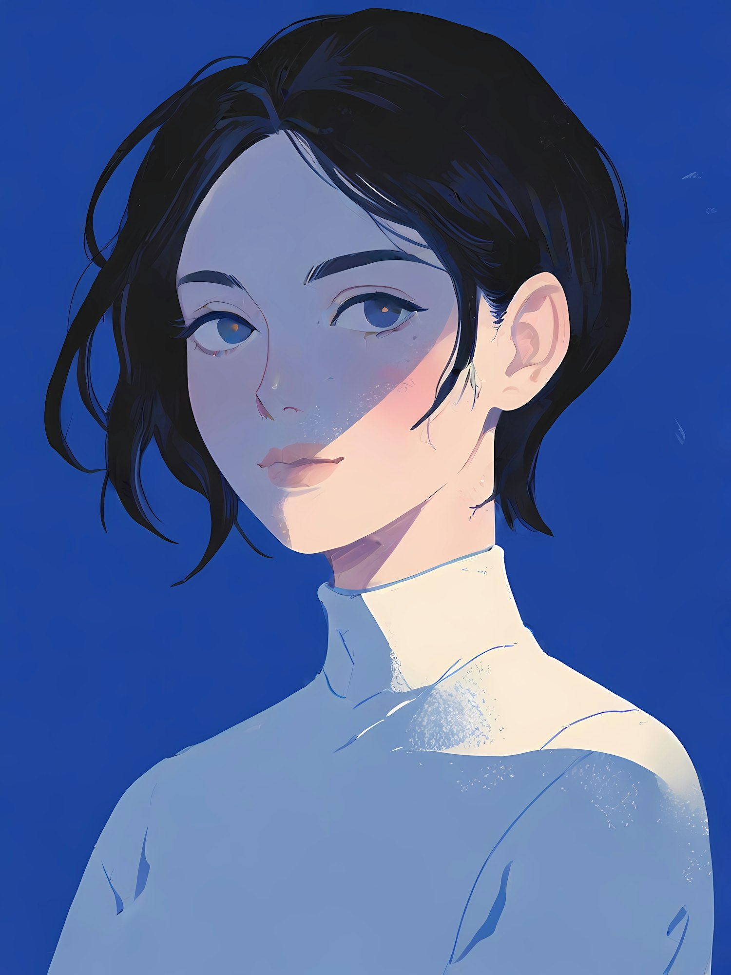 Elegant digital illustration of a serene woman with short black hair and blue eyes against a deep blue background.