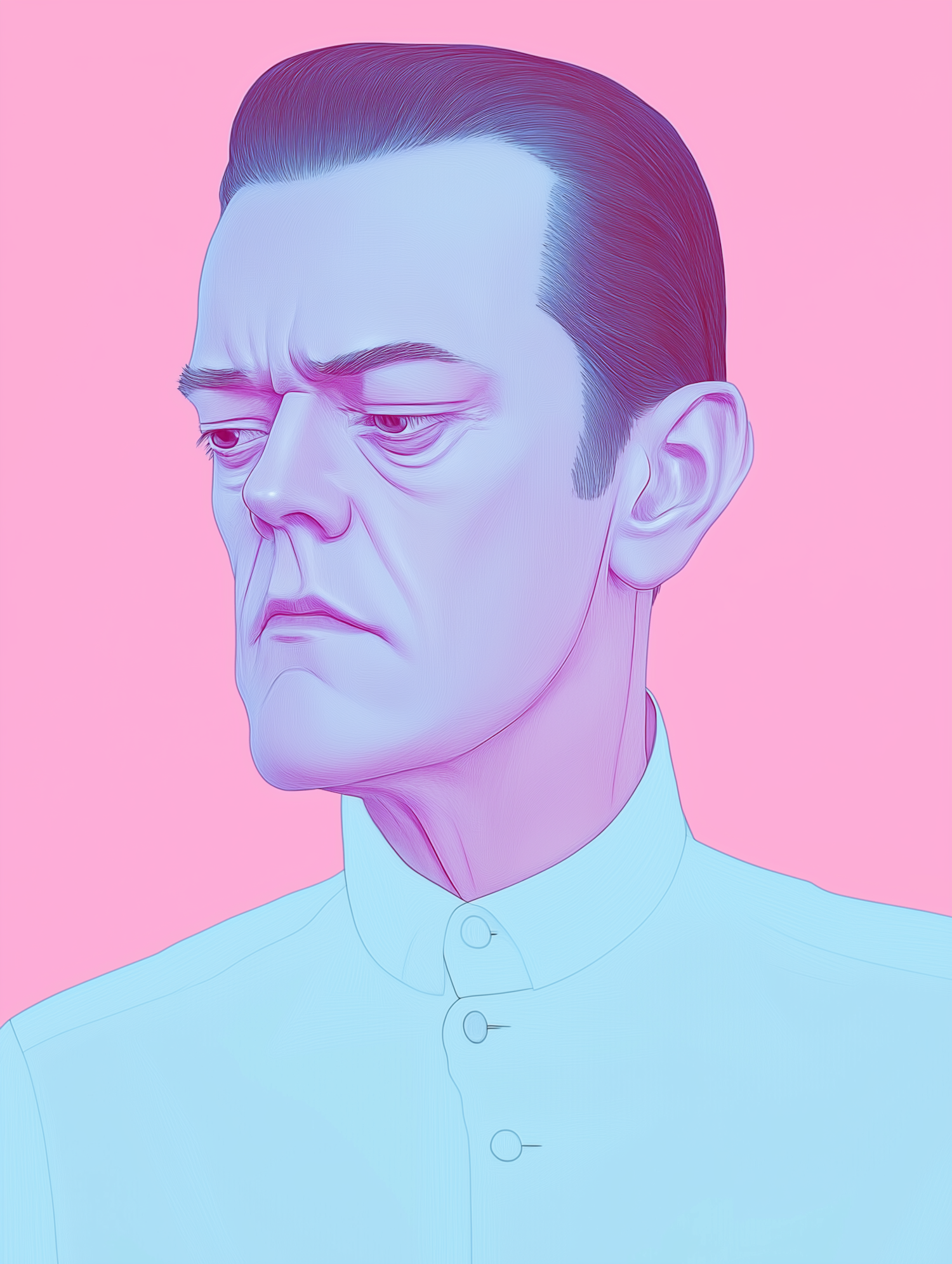 Stylized illustration of a stern man with slicked-back hair and a high-collared shirt, set against a pink background.