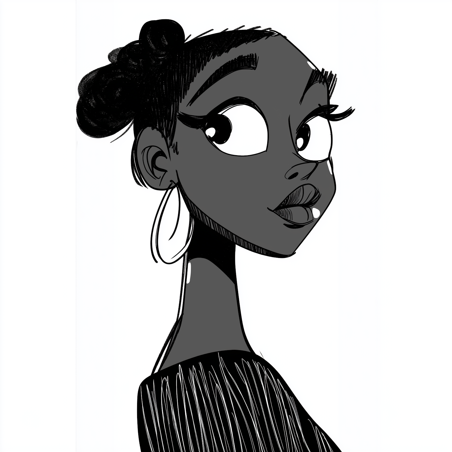 Stylized black and white illustration of a young woman with hoop earrings and hair in buns, featuring expressive eyes and a subtle smile.