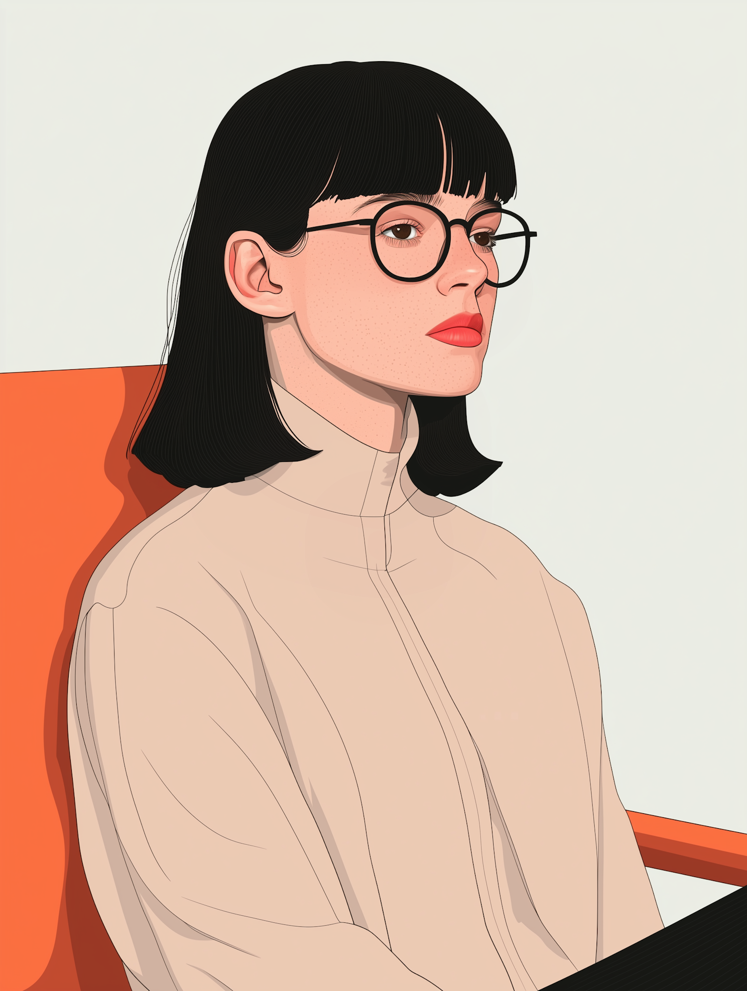 Stylish illustration of a woman with black bob haircut, round glasses, and red lipstick, seated on an orange chair.