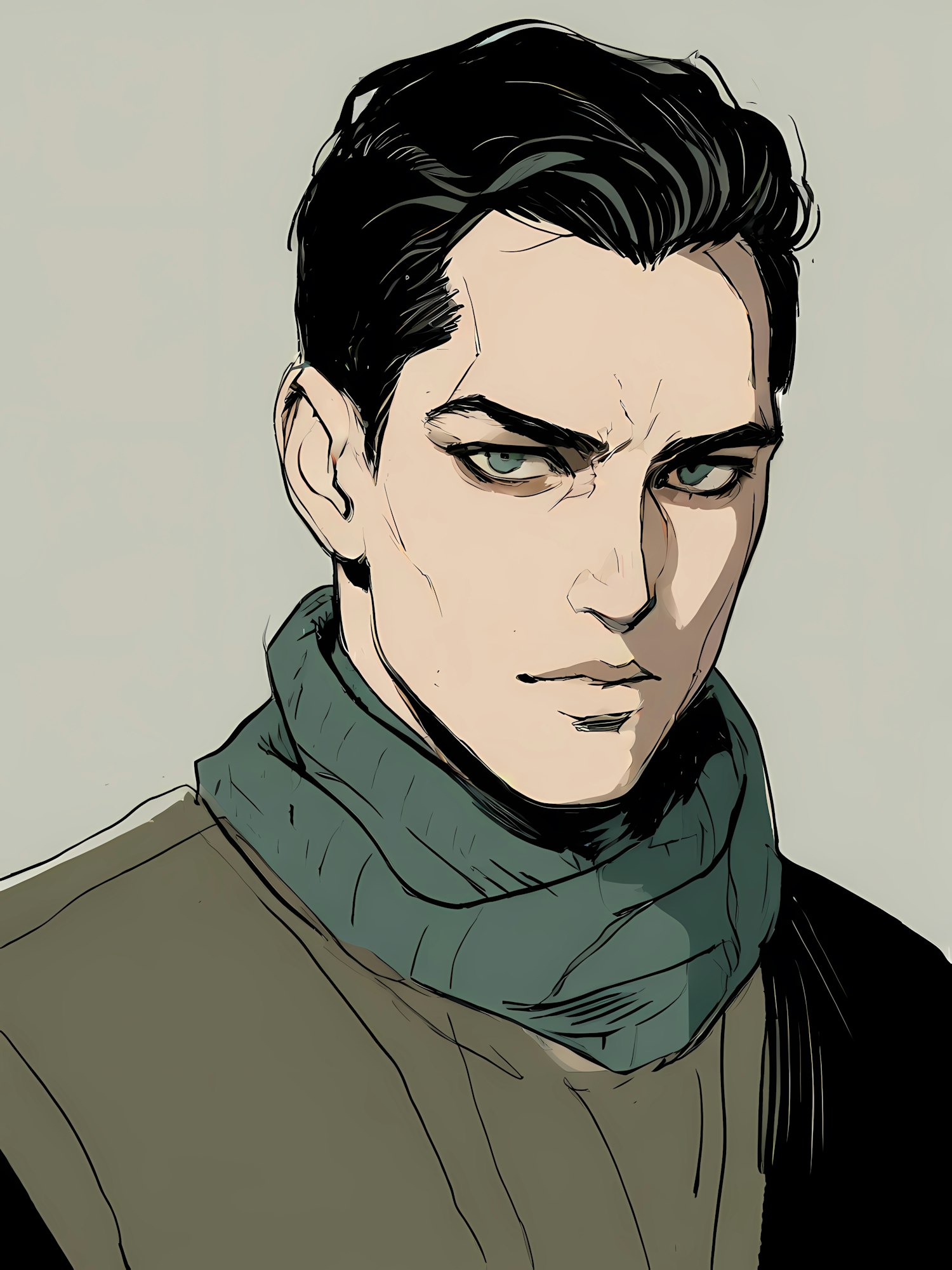 Stylized illustration of a serious young man with green eyes, black hair, and a dark green scarf, set against a light beige background.