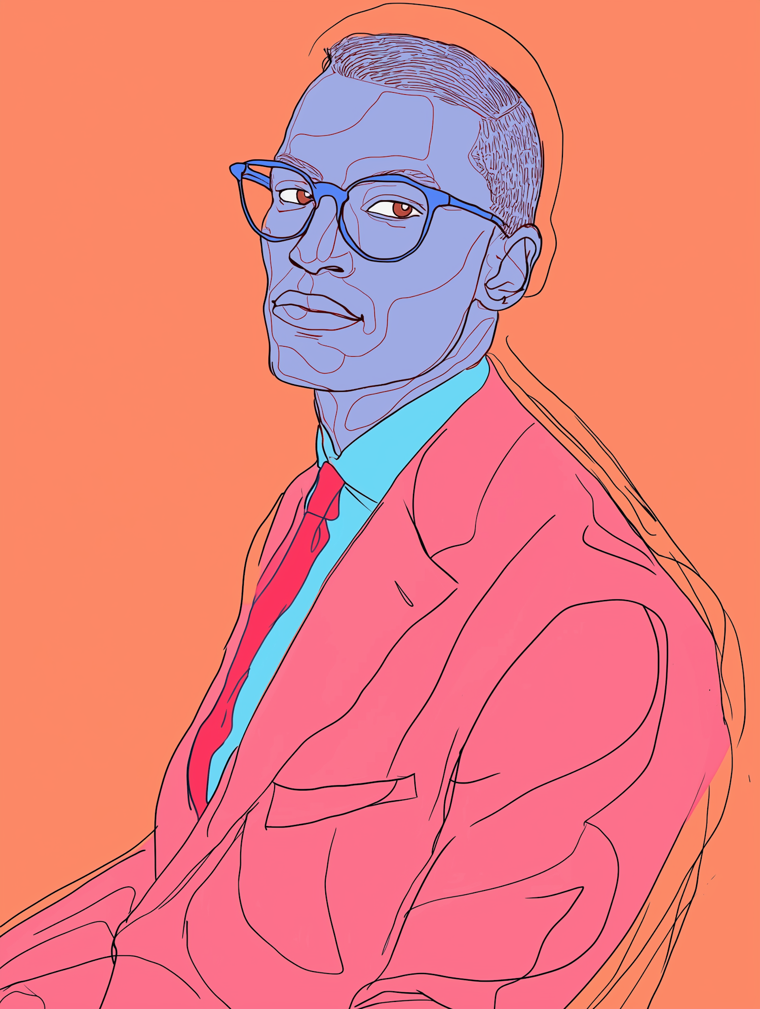 Bold illustration of a man in a pink suit, blue shirt, and red tie, set against an orange background with a modern, minimalistic style.