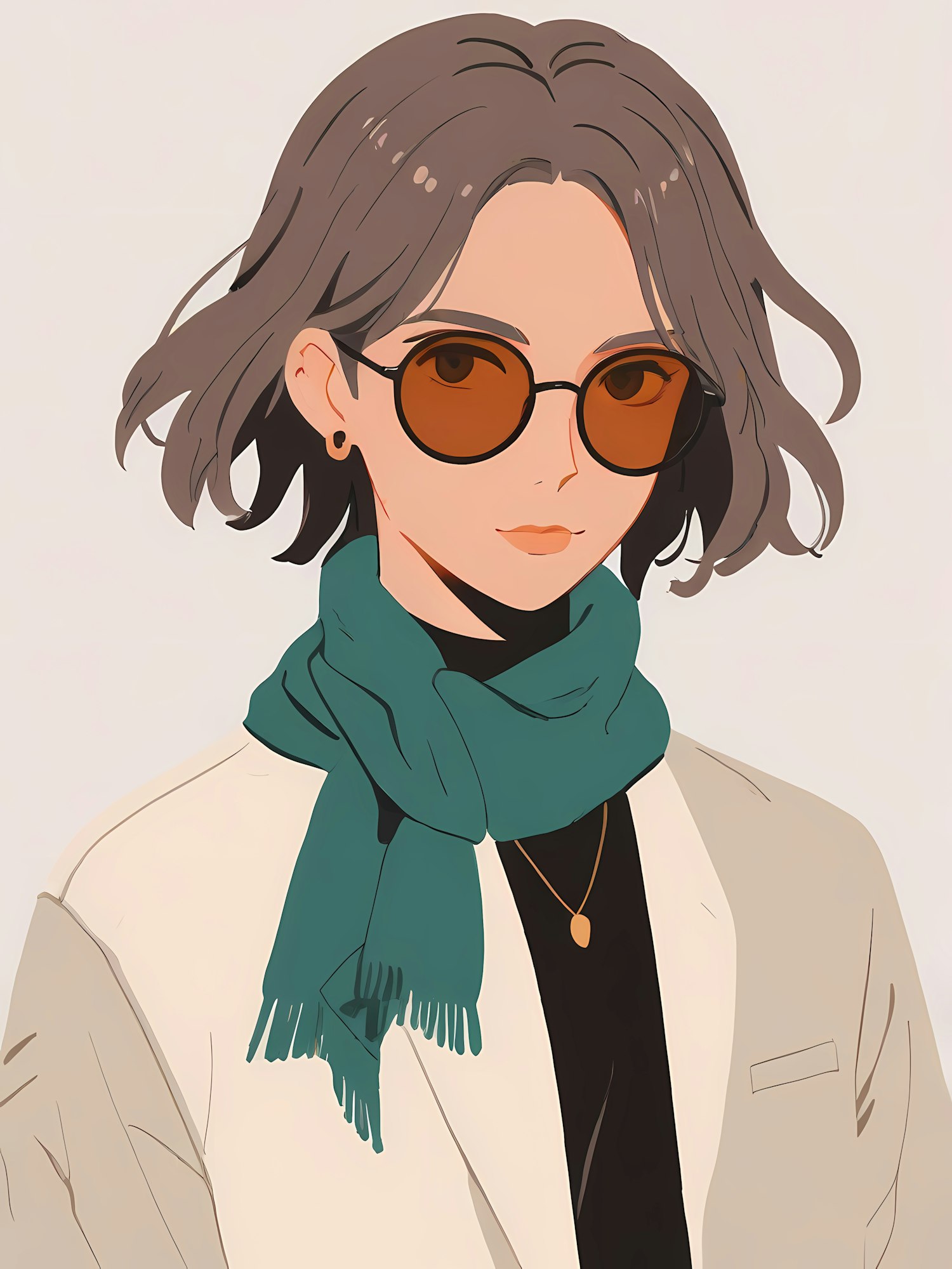 Stylish illustration of a person with sunglasses, teal scarf, and beige blazer, exuding elegance and modern fashion.