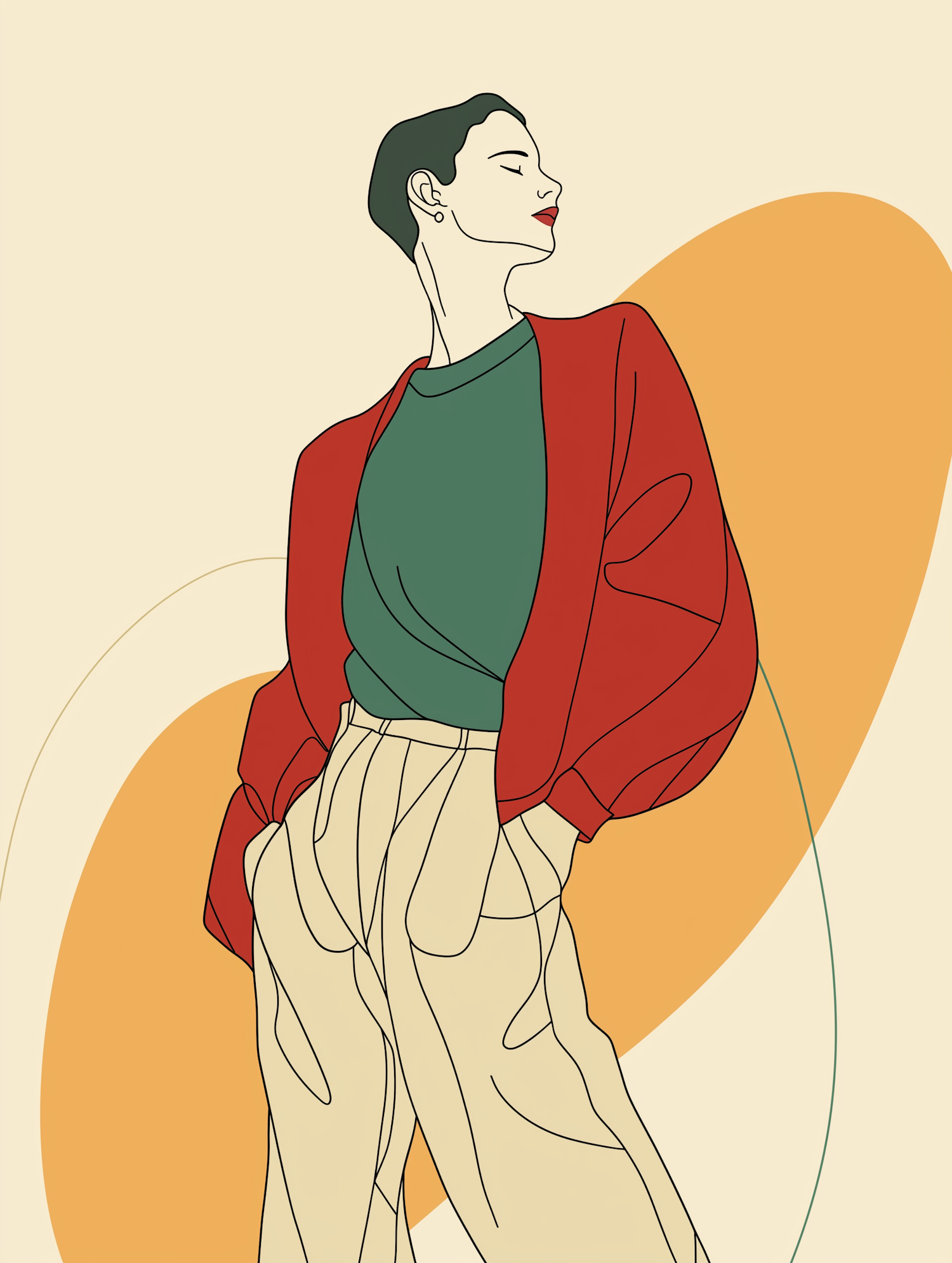 Minimalist illustration of a stylish person in a red jacket, green top, and beige trousers, set against abstract orange and beige shapes.