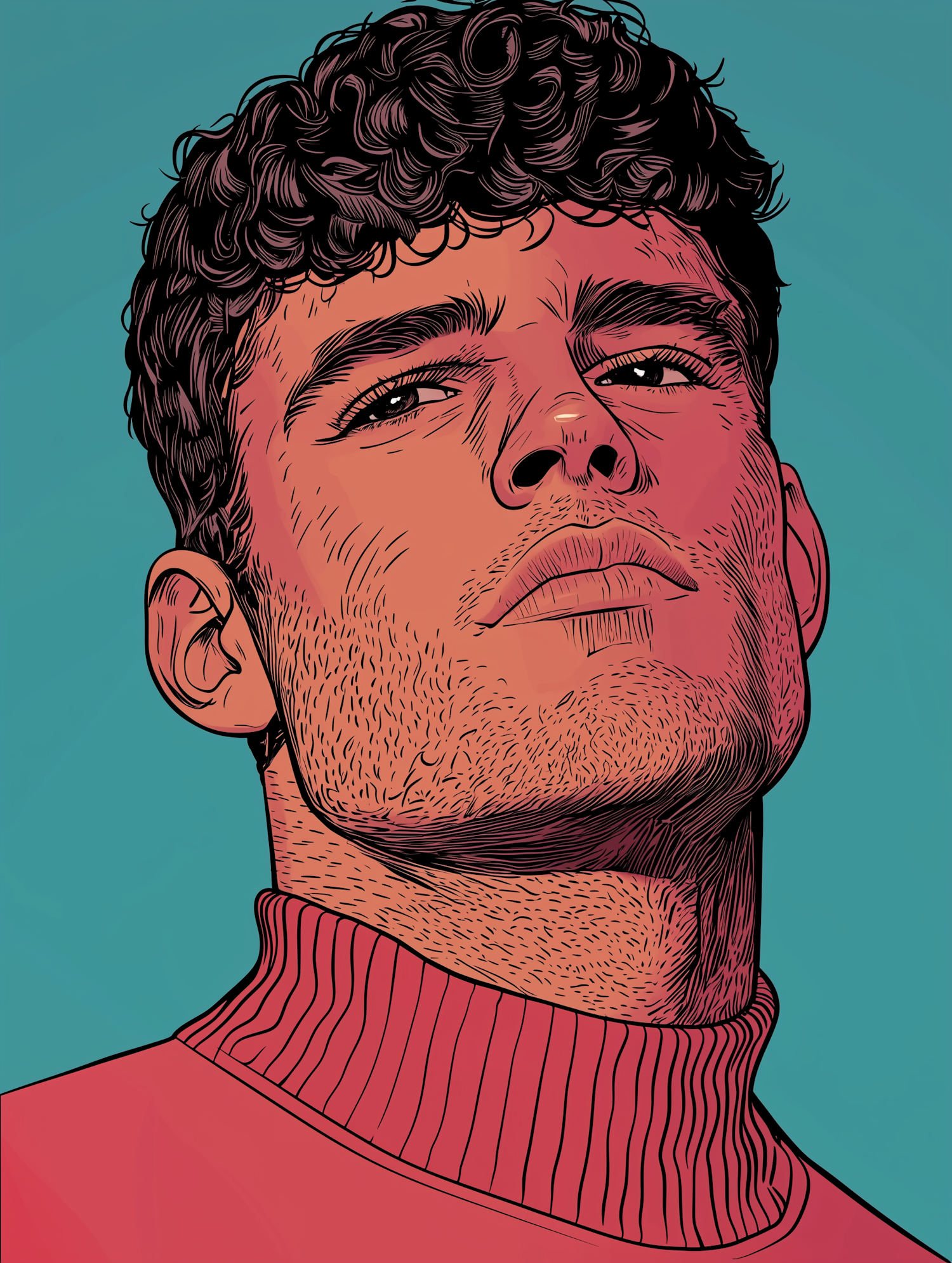 Stylized illustration of a man with curly hair and a red turtleneck against a teal background, showcasing bold lines and shading.