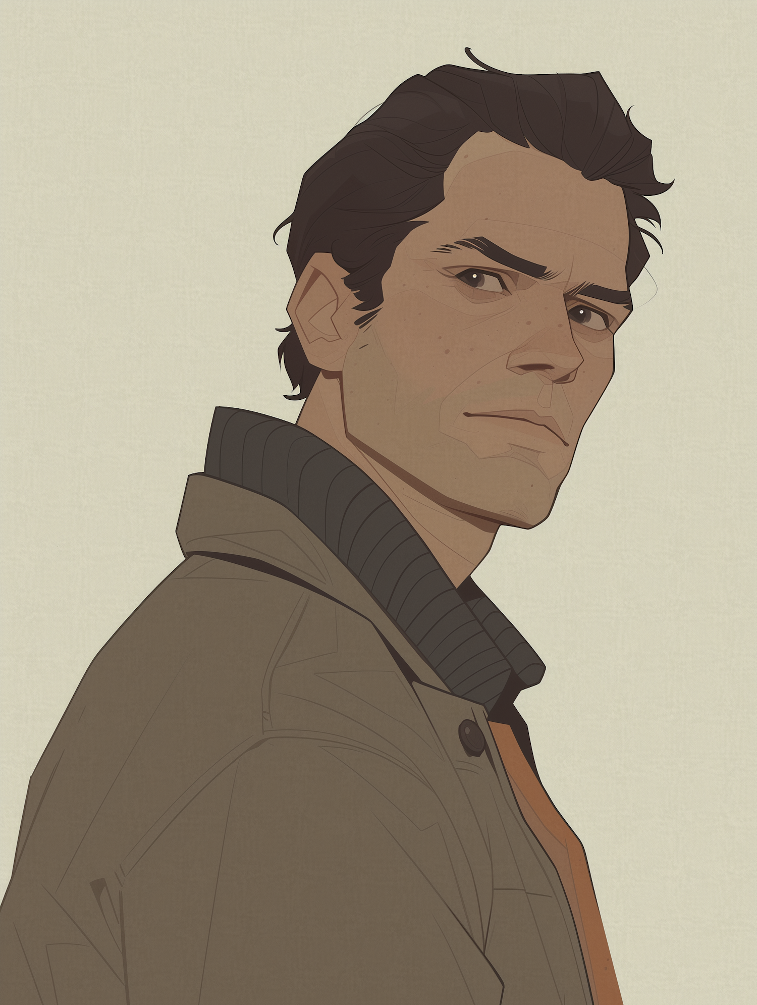 Stylized illustration of a man with dark hair and a serious expression, wearing a green jacket and black turtleneck.