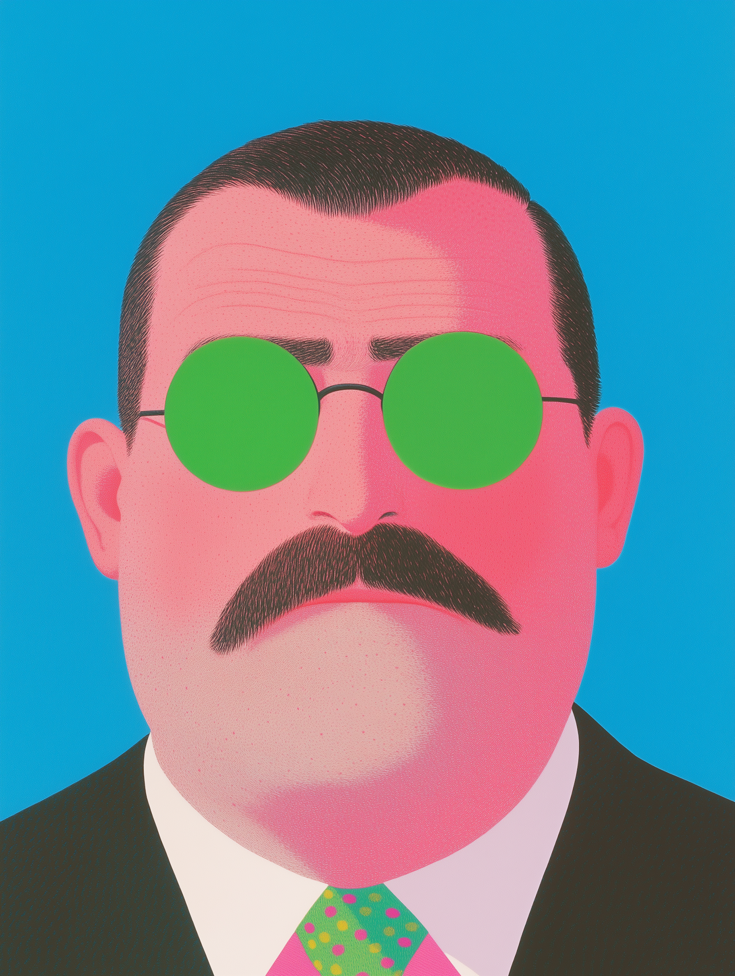 Stylized illustration of a man with green sunglasses, pink complexion, and a black mustache, set against a blue background.