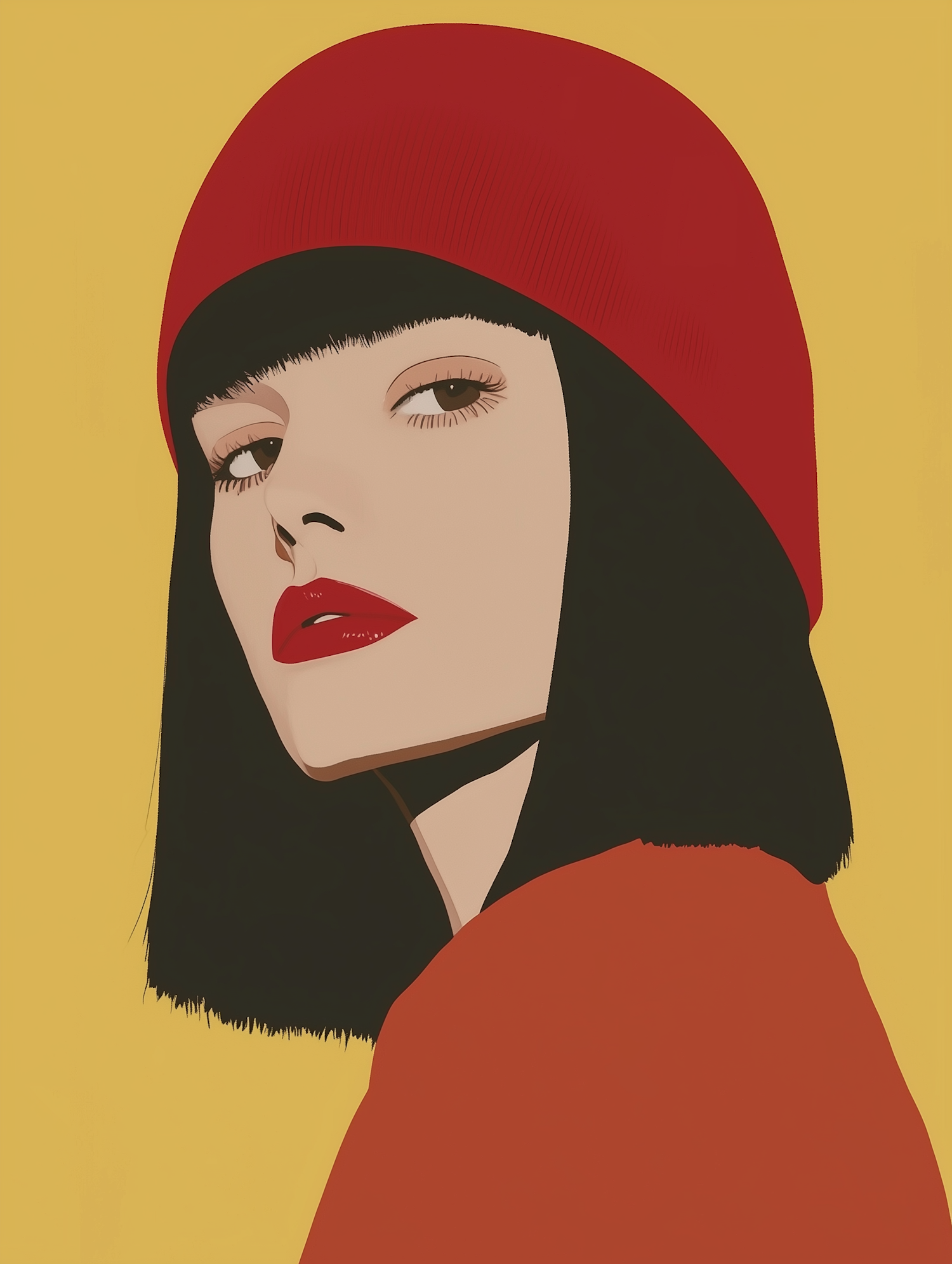 Stylized illustration of a woman with red hat and lipstick, black bob haircut, against a vibrant yellow background.