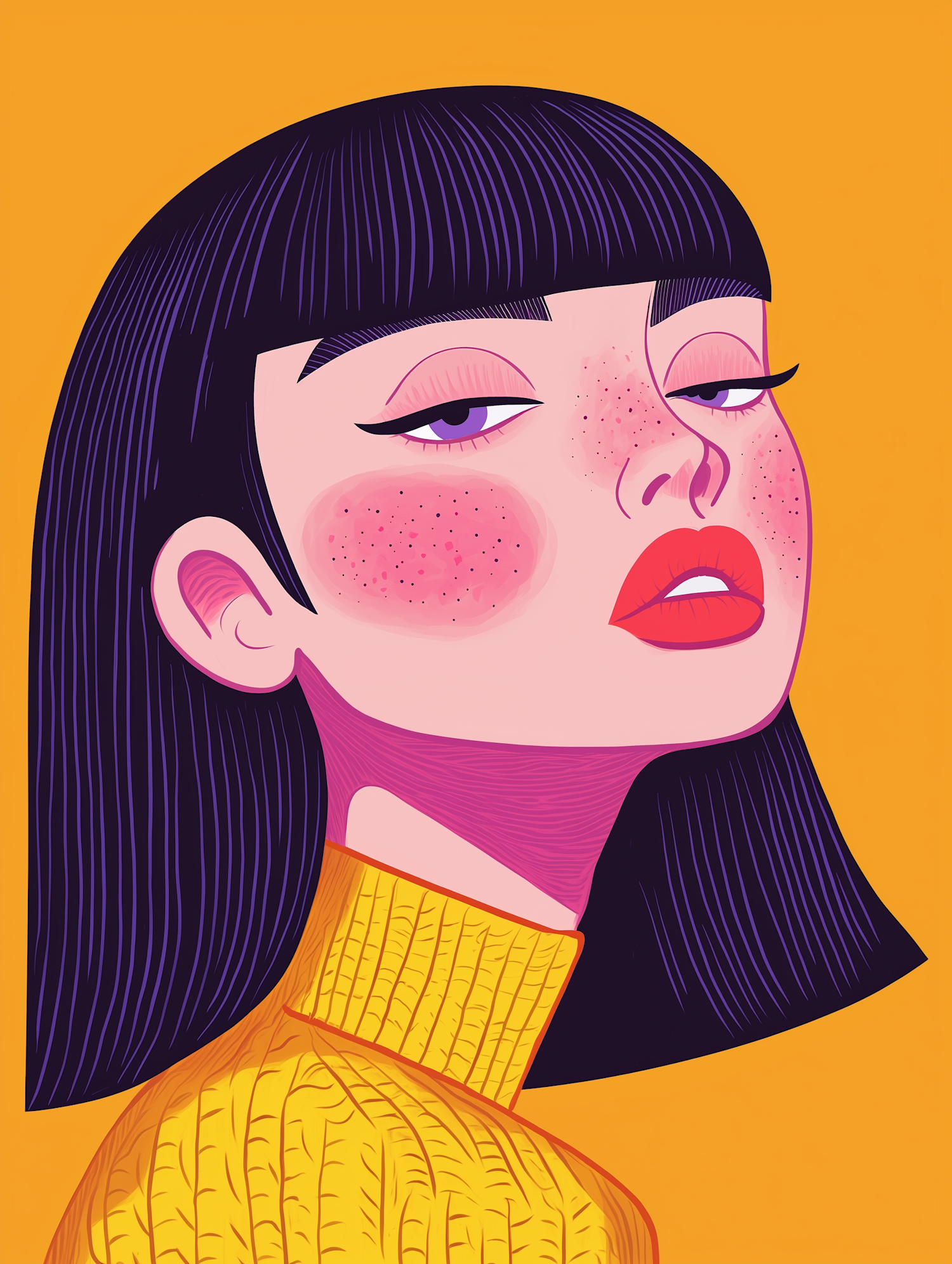 Stylized illustration of a woman with black bob haircut, red lips, and yellow sweater against an orange background.