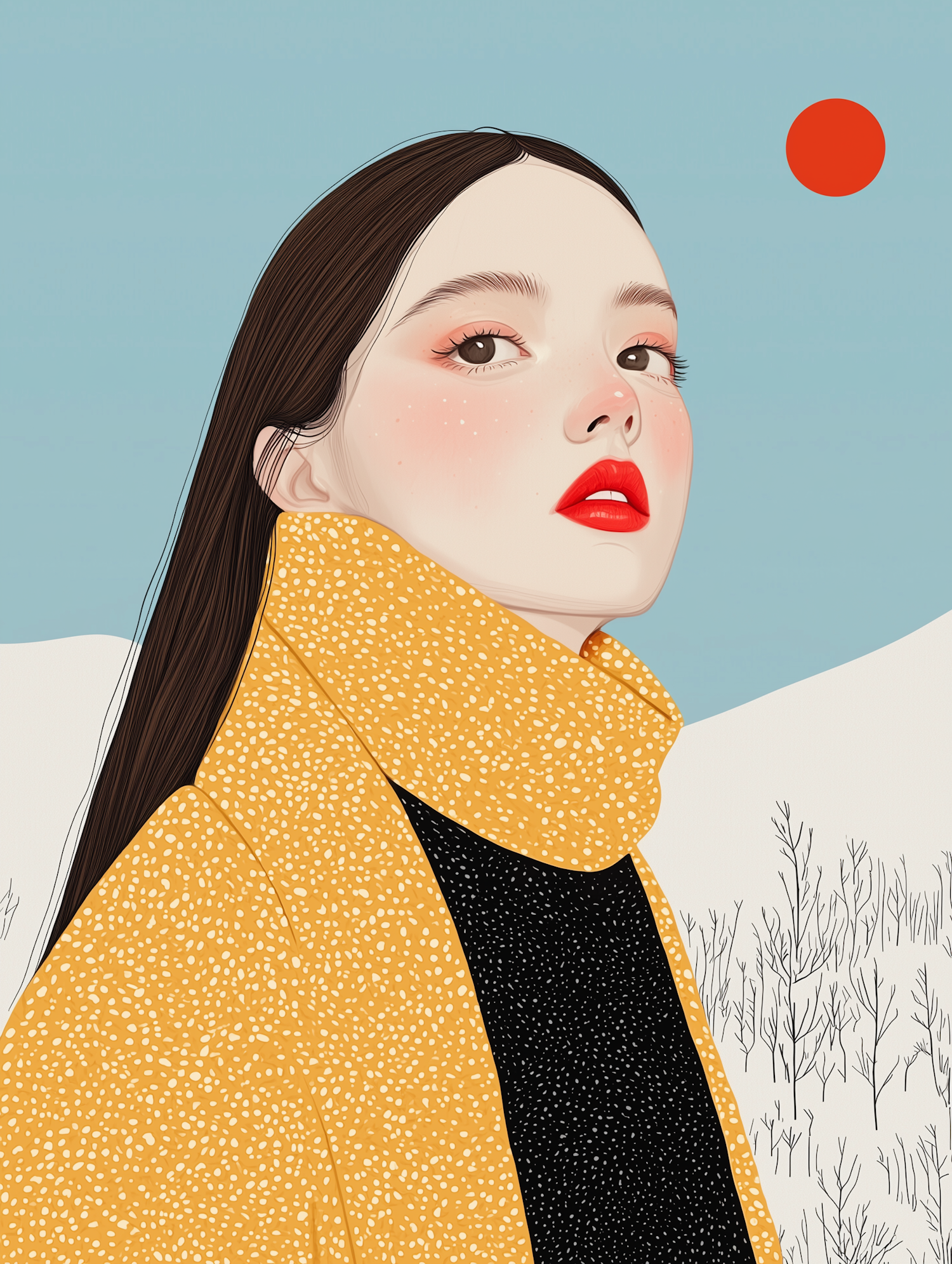 Stylized illustration of a woman in a yellow scarf against a winter backdrop with a red sun and bare trees.