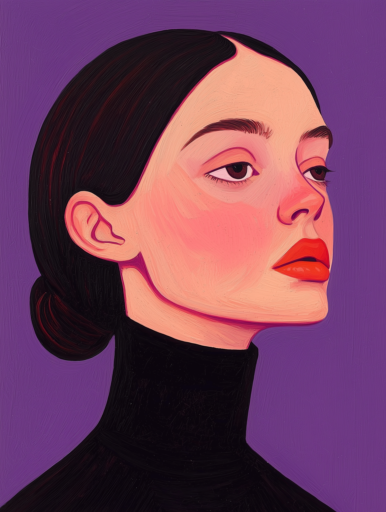 Stylized illustration of a woman with dark hair, red lips, and a black turtleneck against a purple background.