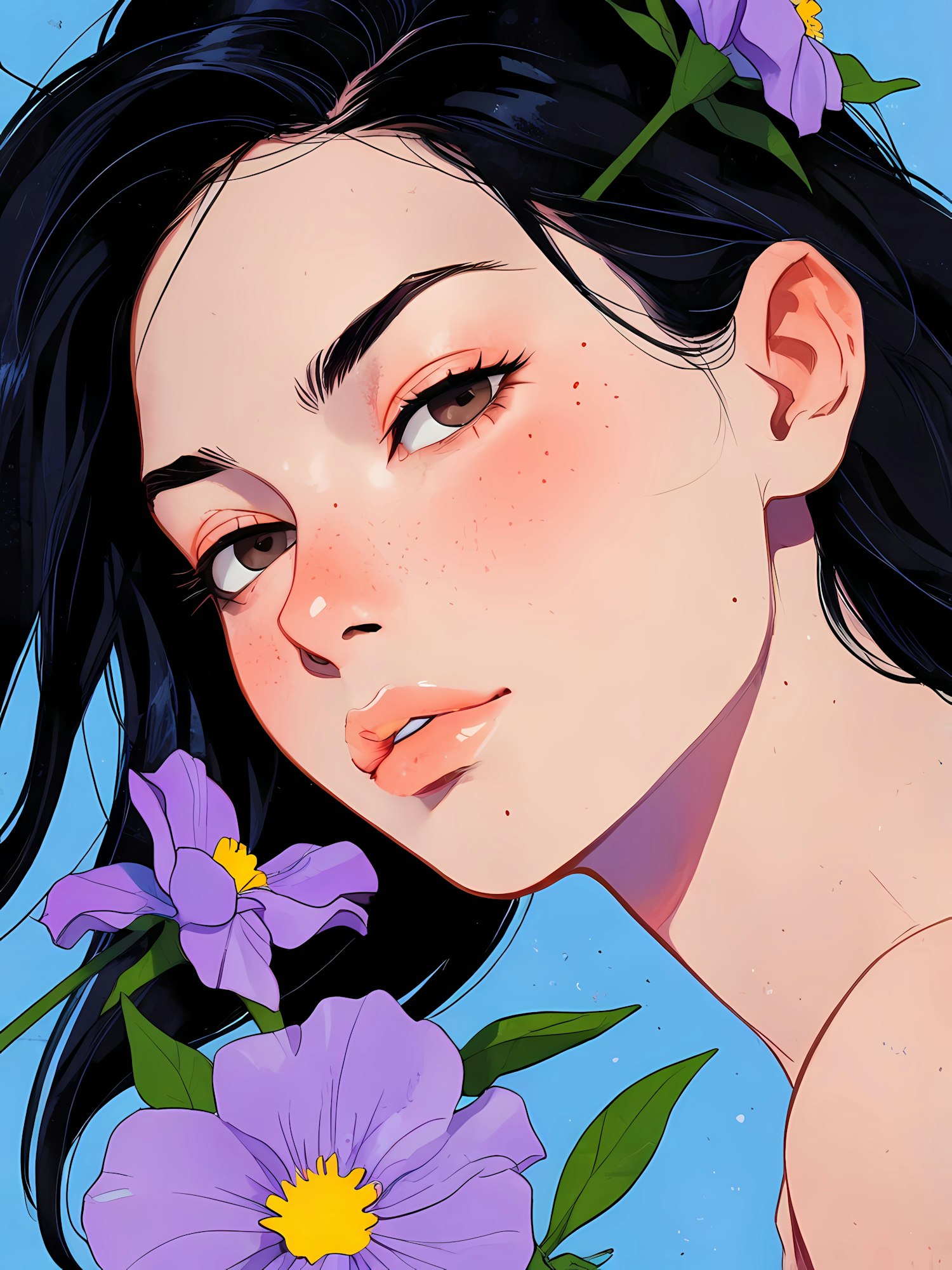 Digital illustration of a woman with dark hair and purple flowers, set against a blue sky. Features include freckles and a serene expression.