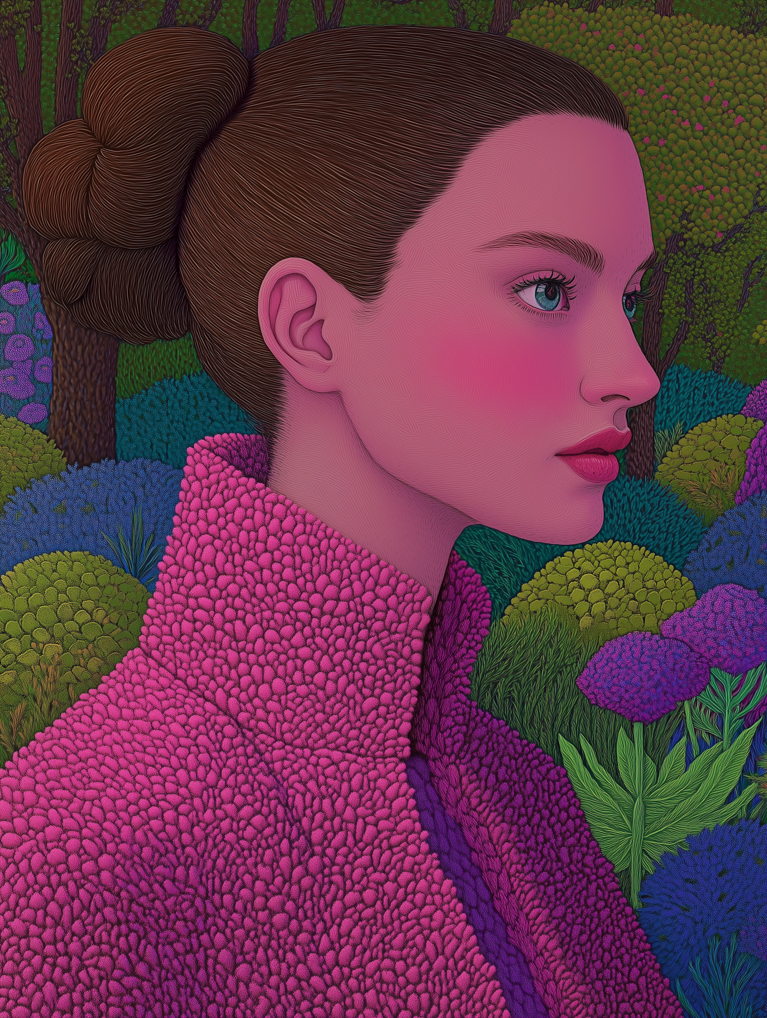 Stylized illustration of a woman in a pink coat against a vibrant, abstract foliage background. Elegant and colorful design.