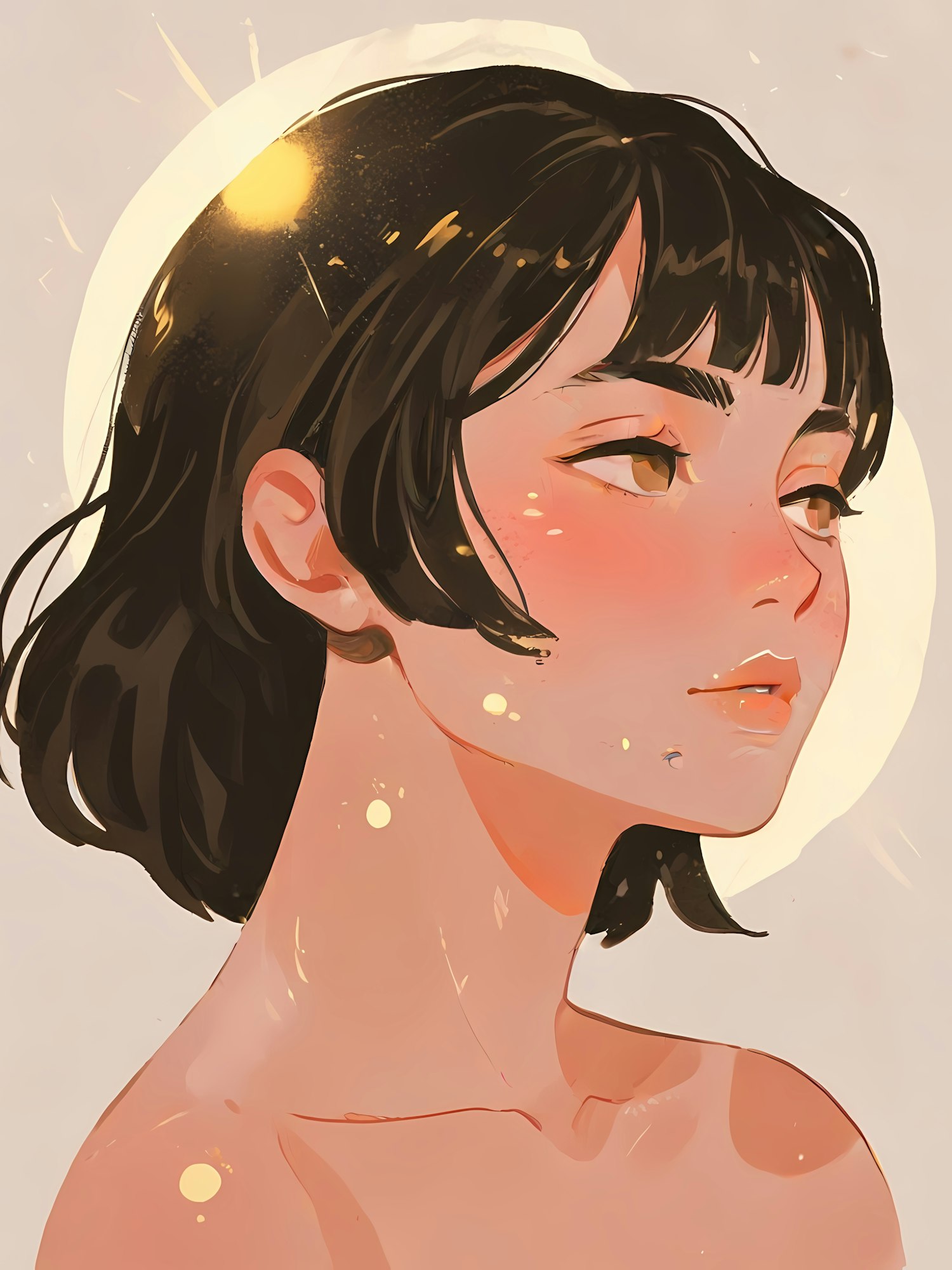 Ethereal digital portrait of a young woman with short dark hair, glowing halo, and golden sparkles on a soft beige background.