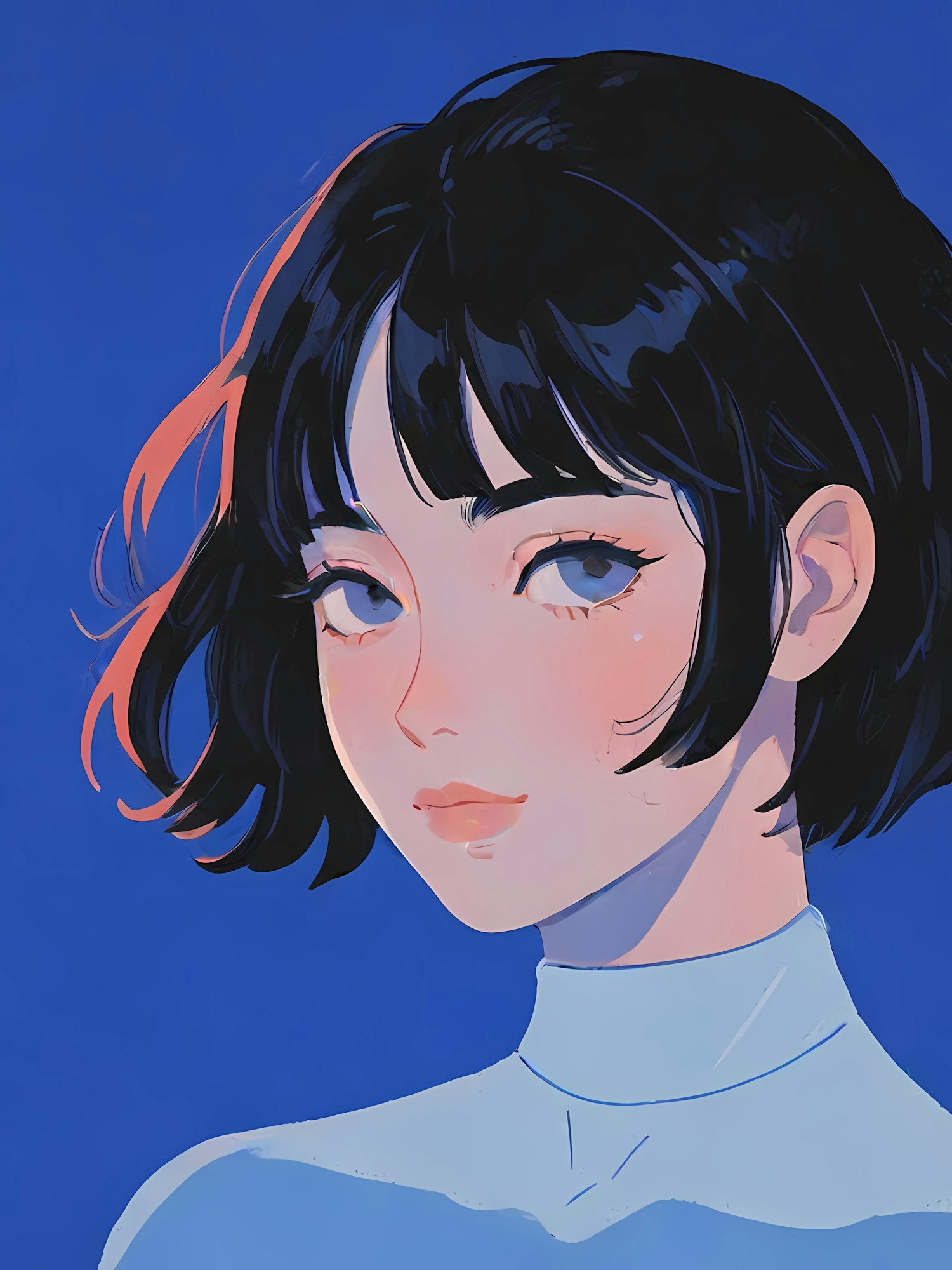 Digital illustration of a young woman with short black hair and blue eyes, set against a deep blue background. Elegant and serene.