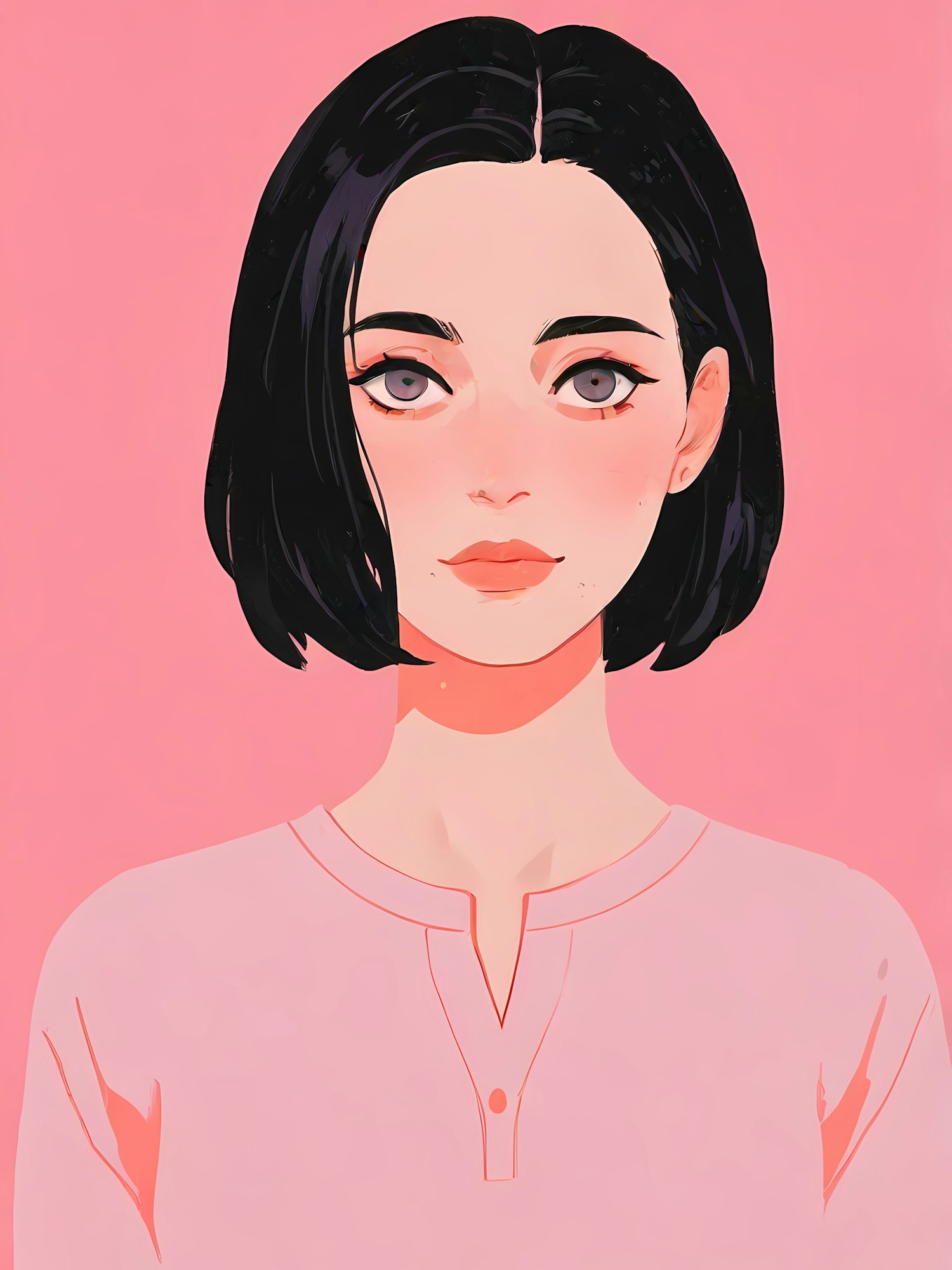 Minimalistic digital illustration of a young woman with sleek black hair, gray eyes, and a pink top against a pastel pink background.