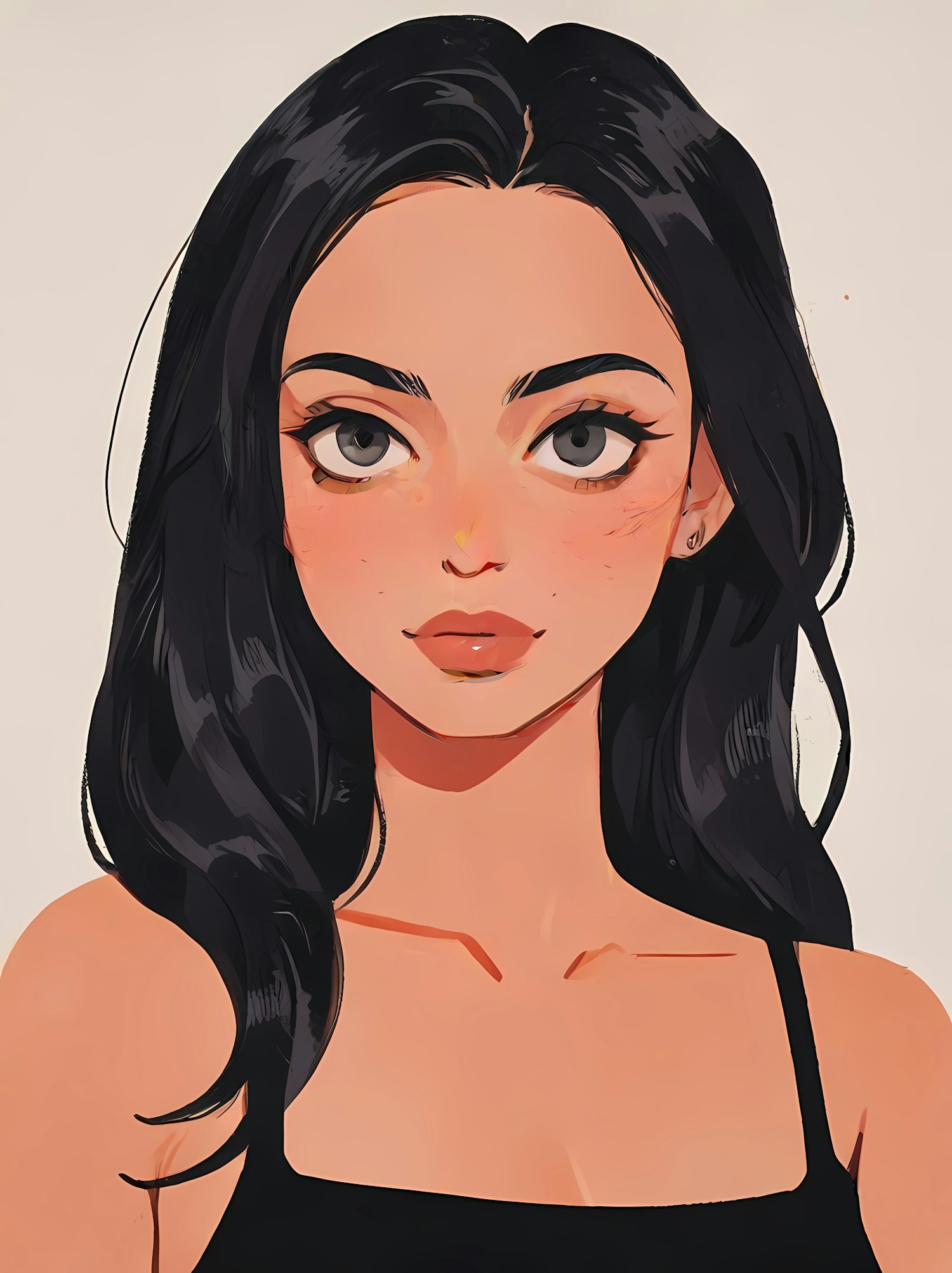 Digital illustration of a young woman with black hair and gray eyes, wearing a black top. Her serene expression is captivating.