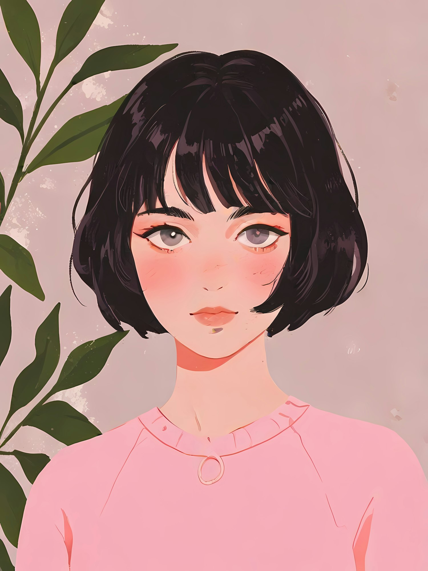 Digital illustration of a serene young woman with short black hair, wearing a pink top, set against a leafy background.