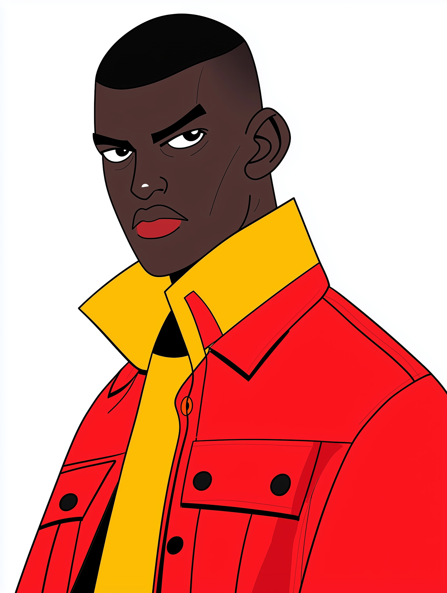 Bold illustration of a Black male character in a red jacket with a yellow collar, showcasing a serious expression and vibrant colors.