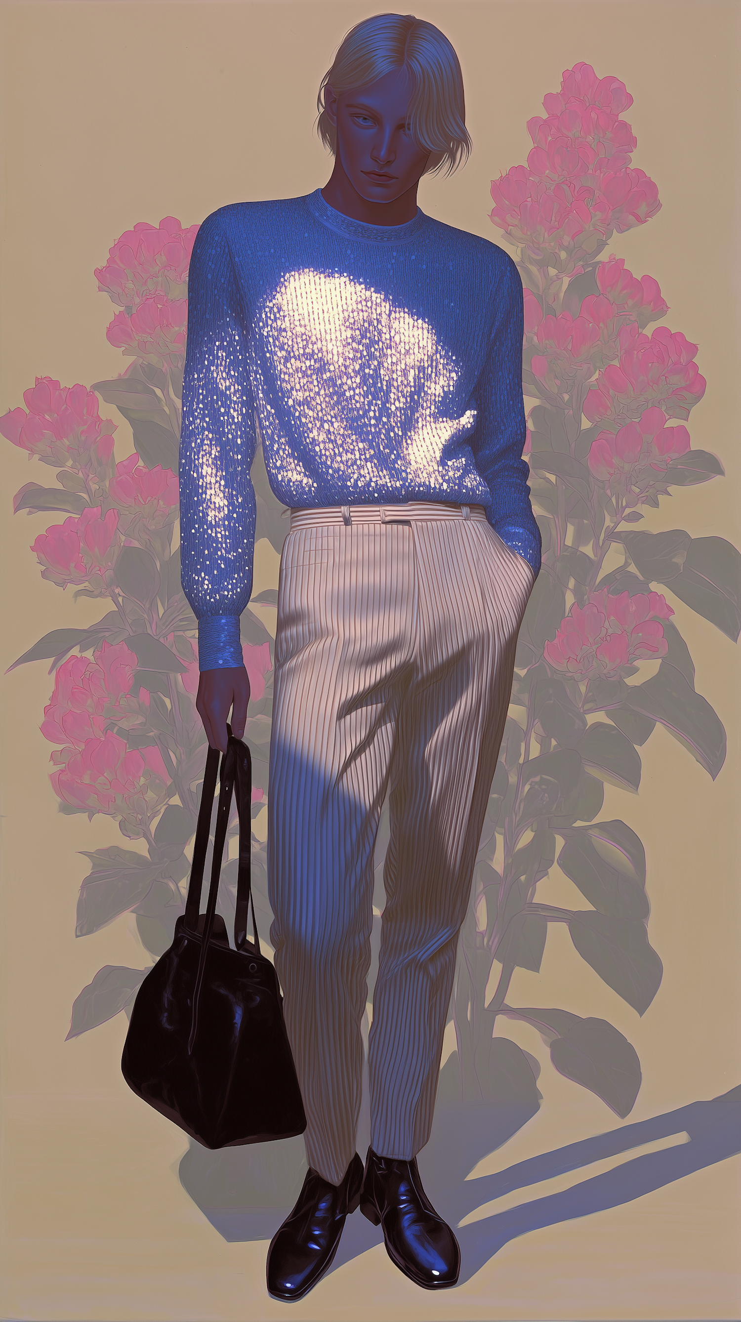 Stylized illustration of a person in a shimmering blue sweater and white trousers, holding a black bag, with pink flowers in the background.