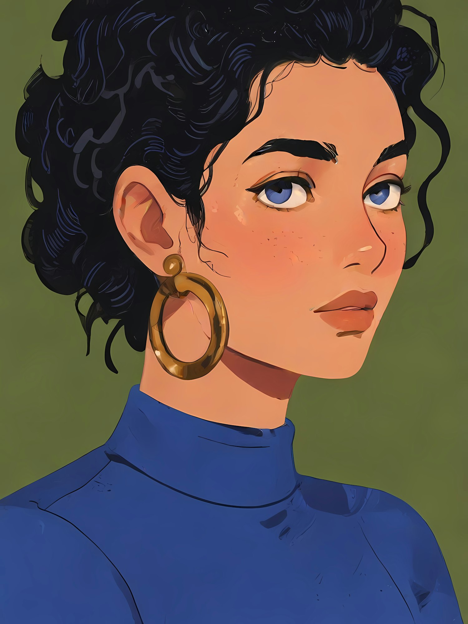 Stylish illustration of a woman with curly black hair, blue eyes, and gold hoop earrings against an olive green background.