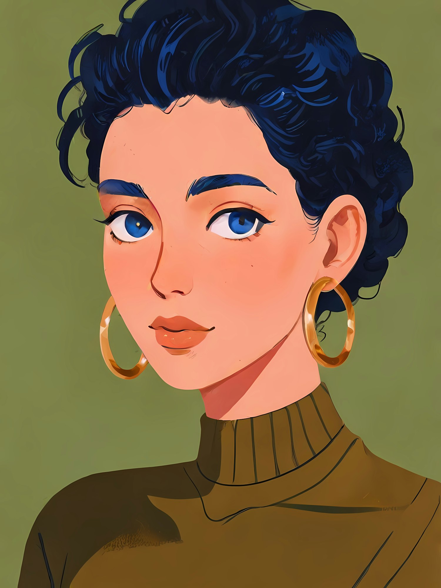 Stylized illustration of a woman with blue eyes, curly black hair, and gold hoop earrings against a green background.