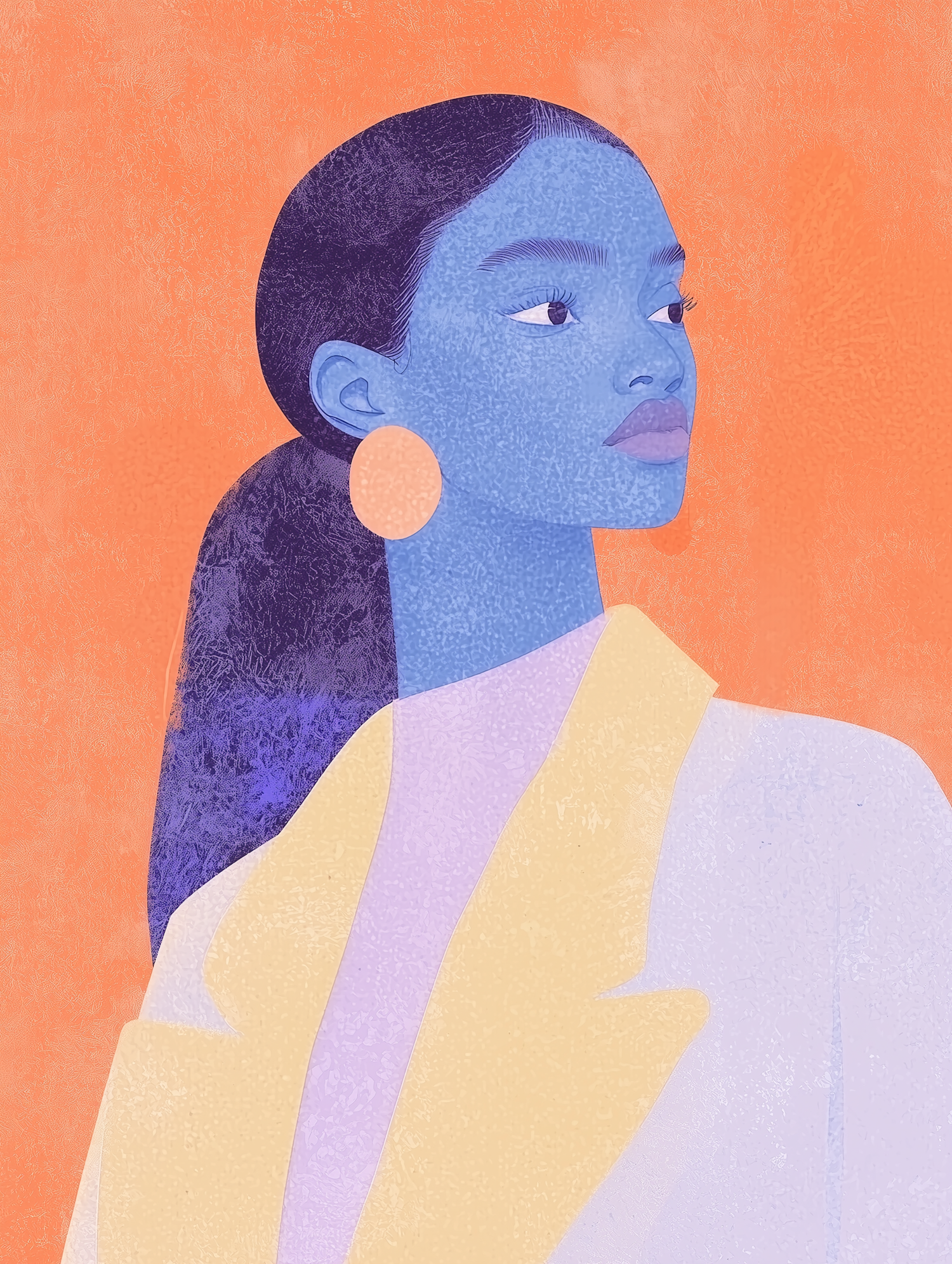 Stylized illustration of a woman with blue skin, dark hair, and peach earrings against a vibrant orange background.