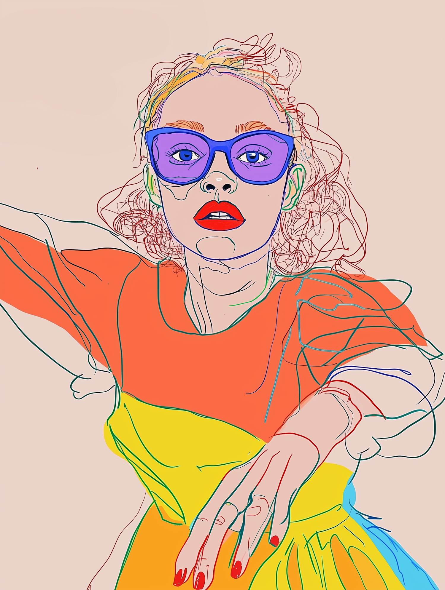 Colorful illustration of a woman with curly hair, purple glasses, and a vibrant outfit, exuding confidence and style.