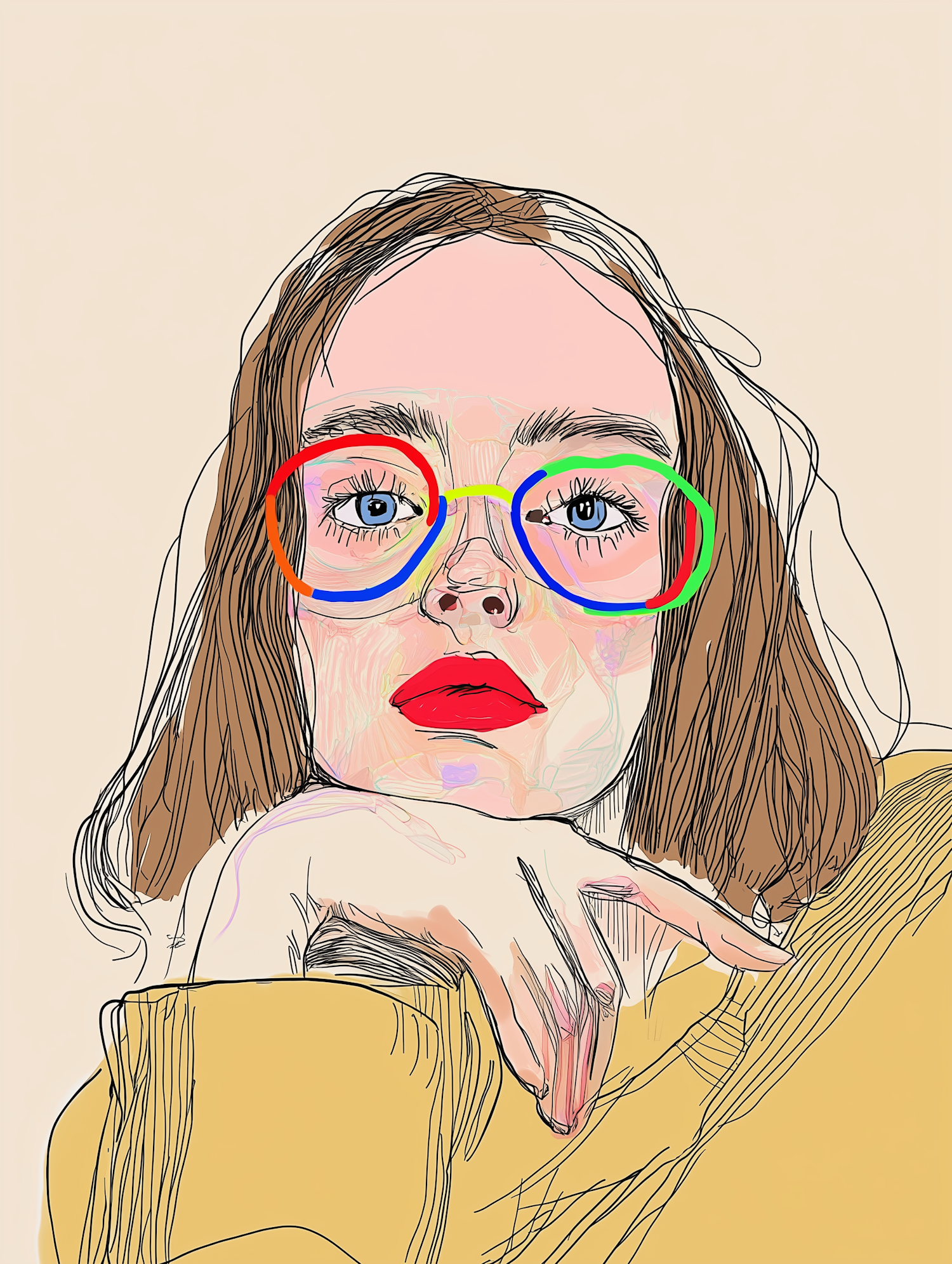 Stylized illustration of a woman with colorful glasses, red lips, and a yellow outfit against a beige background.