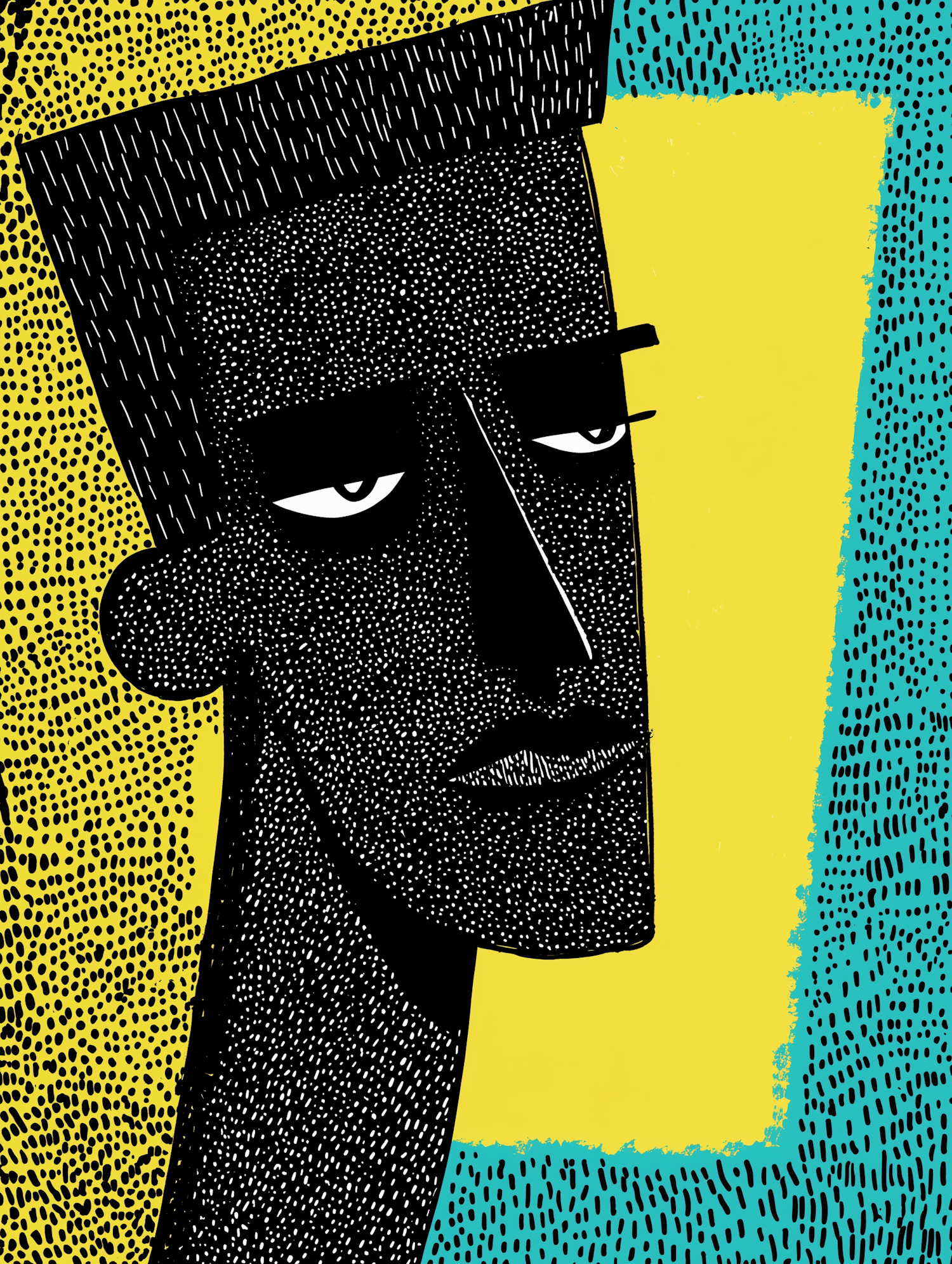 Abstract illustration of a geometric face with a dotted texture, set against a vibrant yellow and teal background.