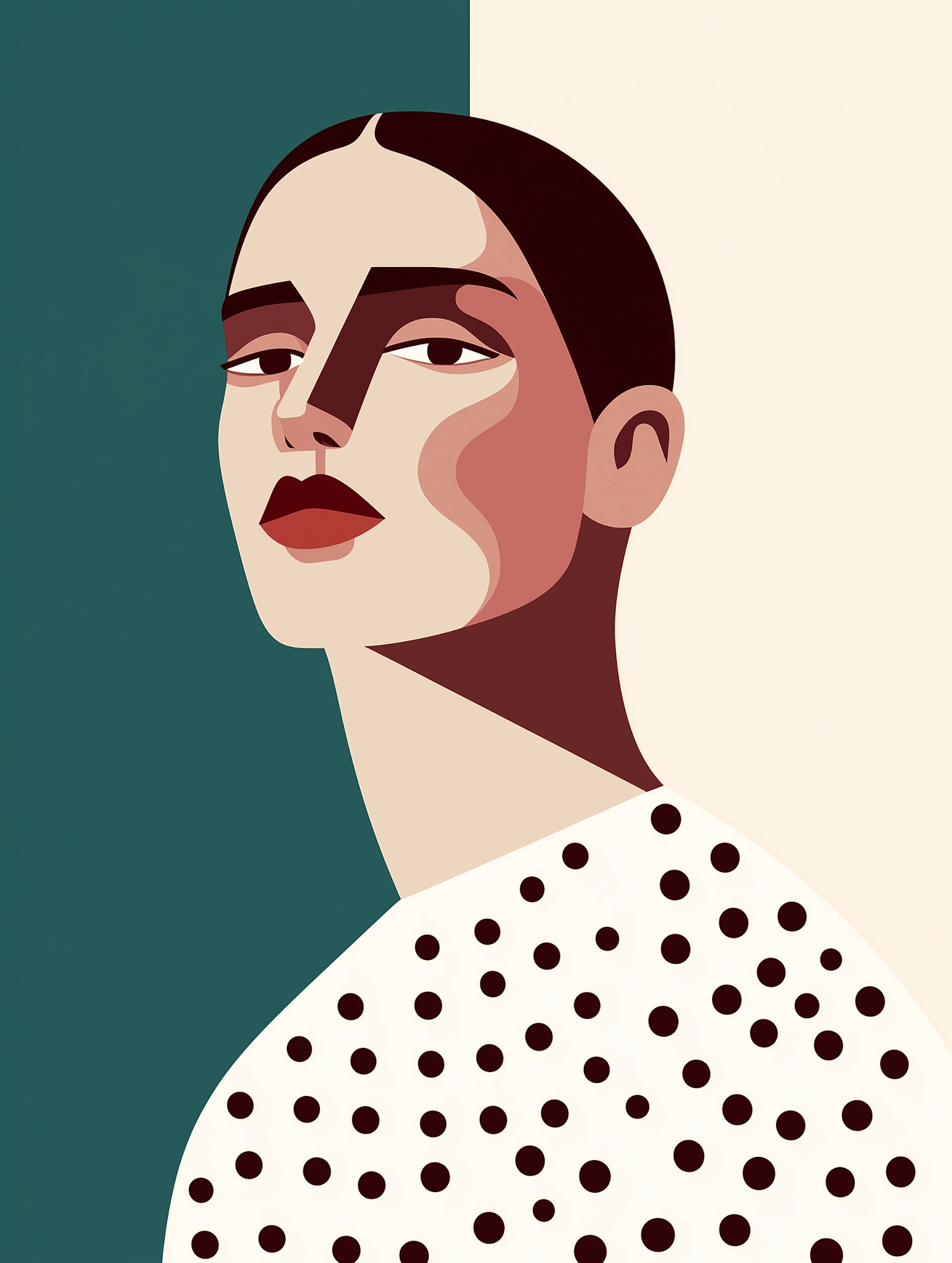 Minimalist geometric illustration of a woman with bold features, polka-dot top, and a split green and cream background.