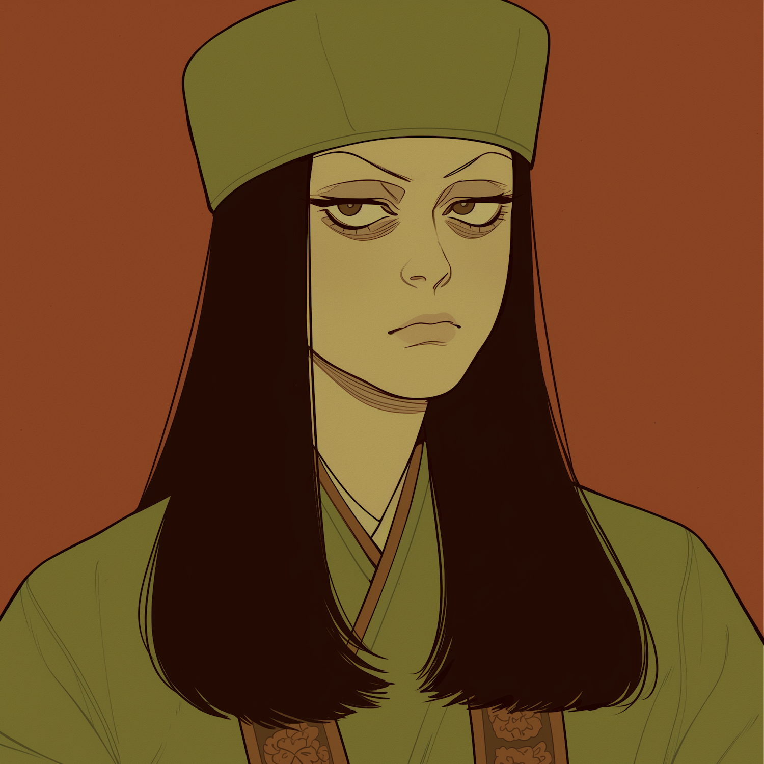 Stylized illustration of a person in green traditional attire with a serious expression against a warm brown background.