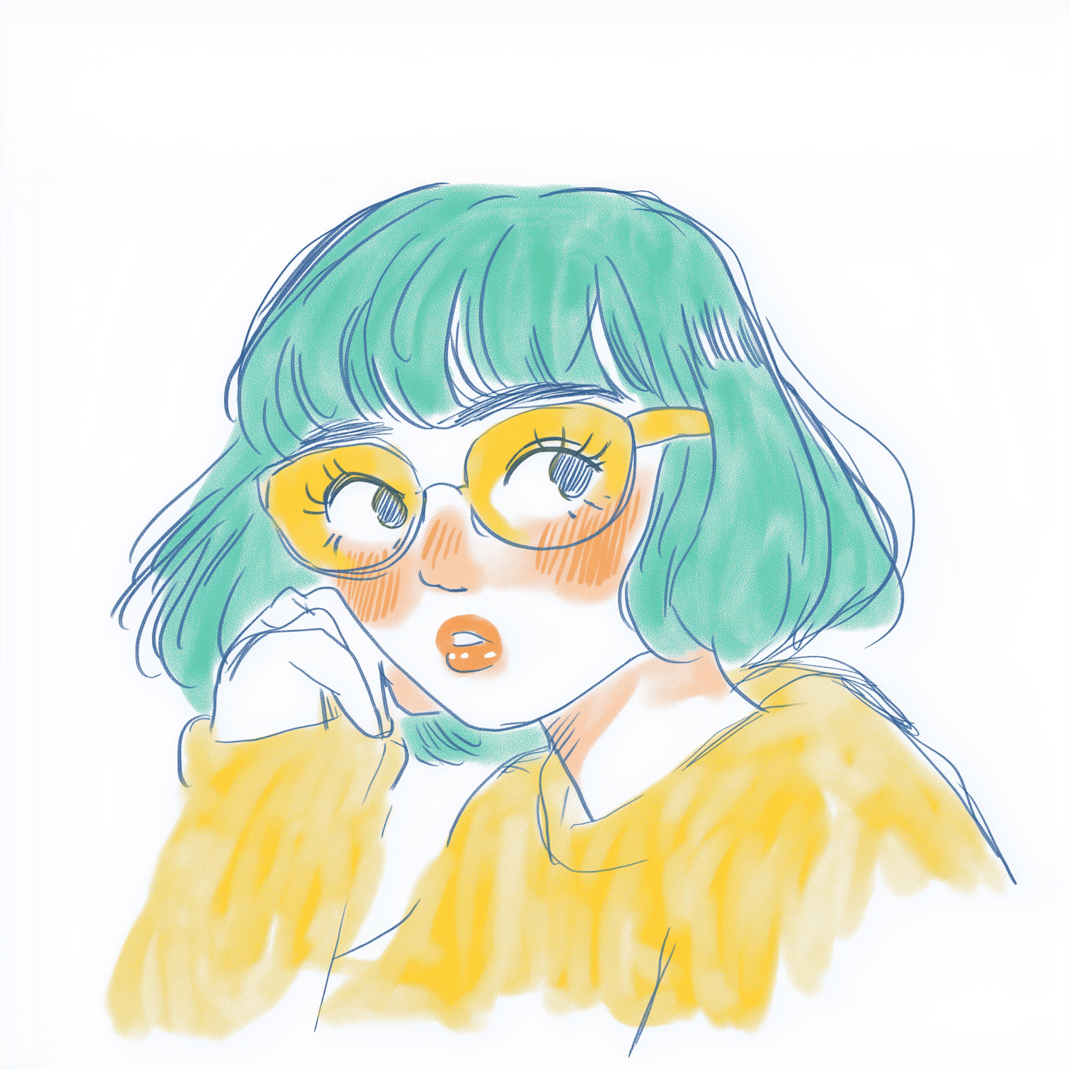 Whimsical illustration of a young woman with green hair, yellow glasses, and a matching sweater, exuding a playful and curious vibe.