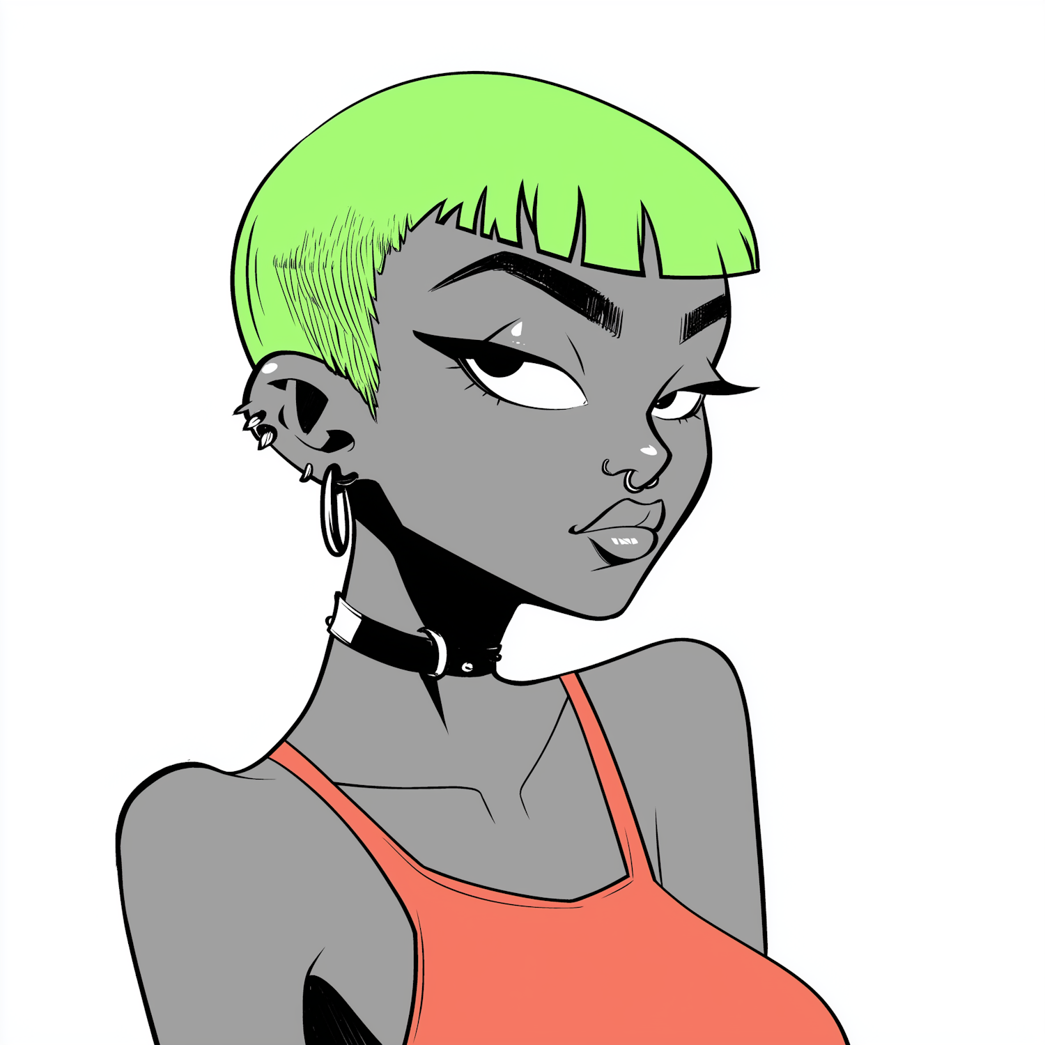 Stylized illustration of a person with green hair, gray skin, and edgy accessories, wearing a red-orange tank top.