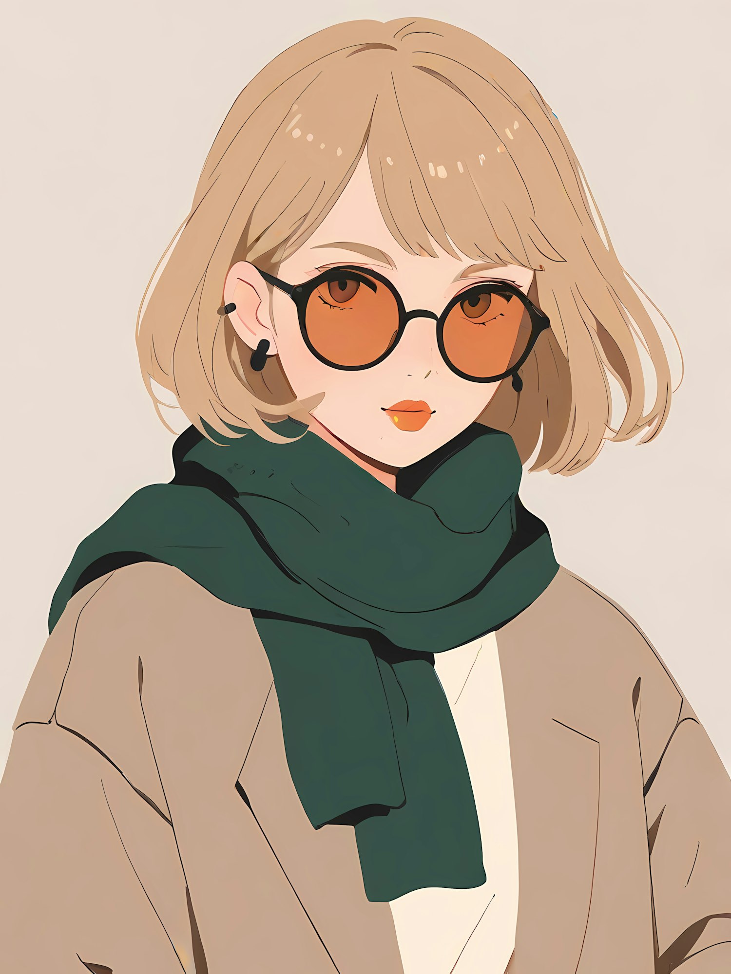 Chic illustration of a woman with blonde bob, orange sunglasses, and a green scarf, exuding modern style and elegance.