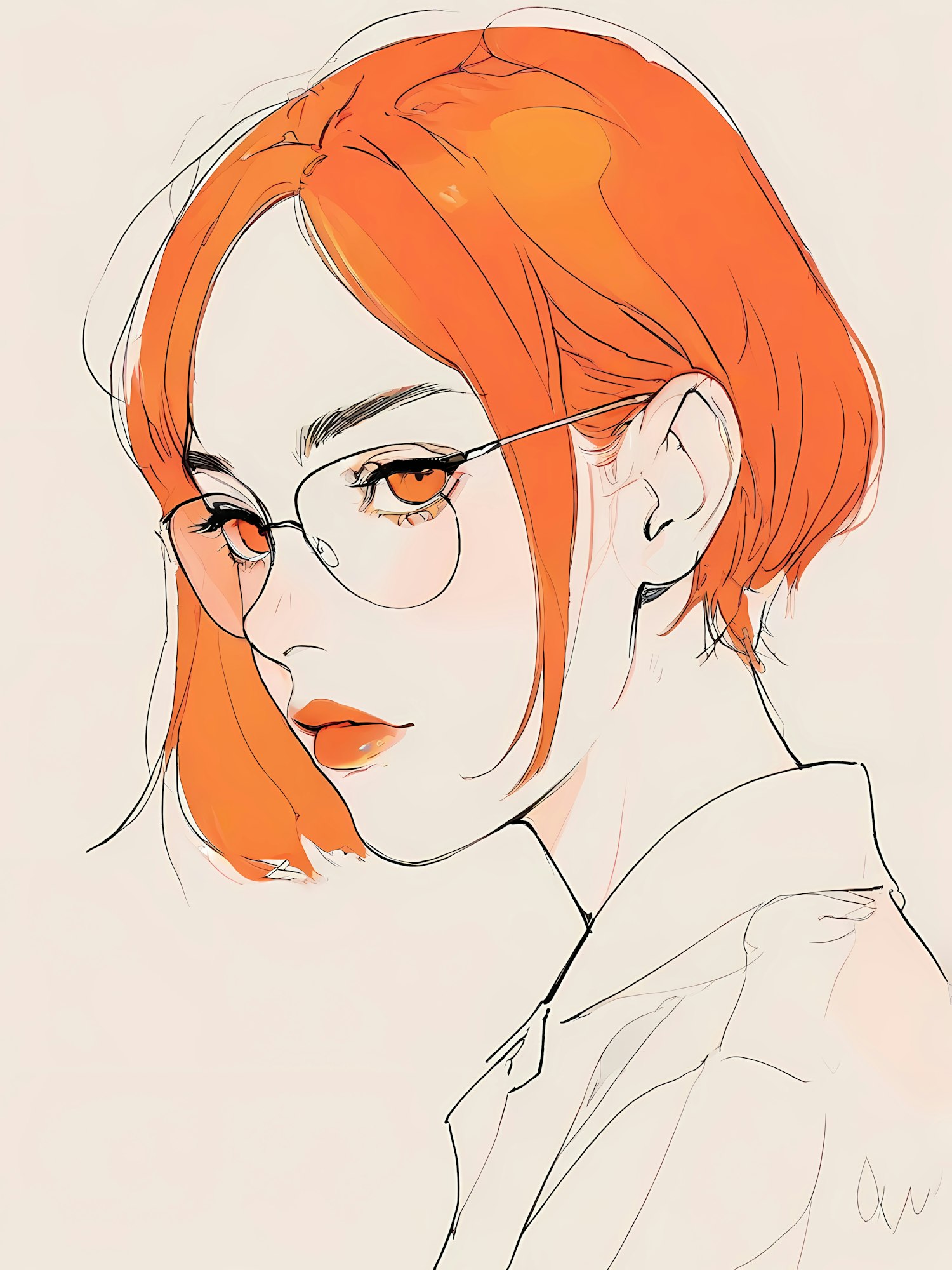 Stylized illustration of a person with orange hair and glasses, featuring expressive orange eyes and a minimalistic color palette.