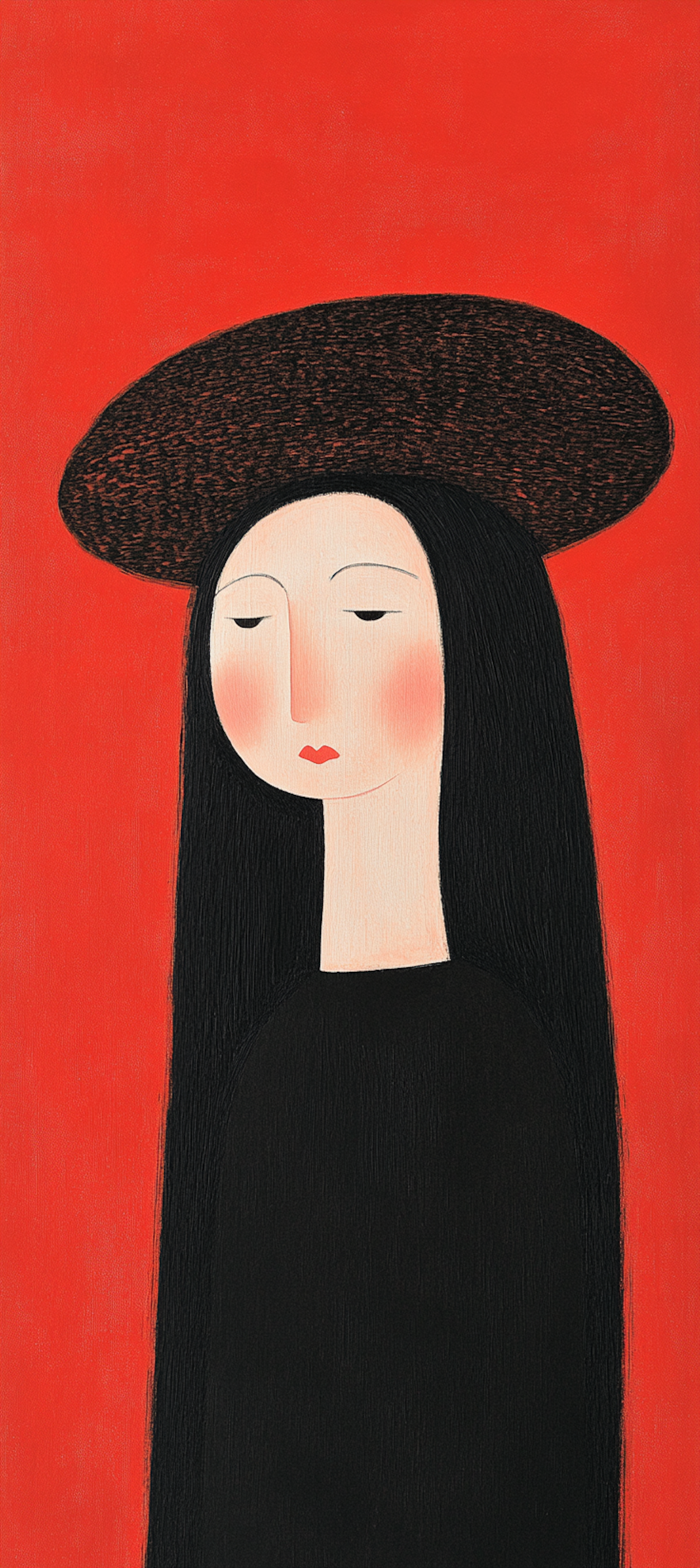Stylized illustration of a serene woman with long black hair and a black hat against a vibrant red background.